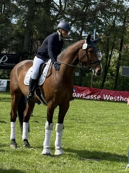 🌟 Cool Running – Versatile and Charming Allrounder with a Great Character 🌟 Gelding | 9 years old | approx. 17.6 hh | Dressage winner up to L level Cool Running is a stunning, expressive gelding with a lot of heart, eagerness to learn, and motivation. He impresses with his excellent rideability, a clear mind, and a consistently positive attitude towards work. He has achieved success in dressage up to L level 🥇, trained at M-N level, demonstrating confident traversals, shoulder-in, extended trot, and currently working on flying changes. In jumping, he has competed up to A** level but has not been further trained in this discipline. He shows great talent, awareness, and enjoyment of jumping – making him an ideal partner for riders seeking a versatile, talented horse. Cool Running is also trail-safe, well-behaved at the farrier and veterinarian, and always reliable in daily handling. 🔹 TÜV: No issues 🔹 Note: Small spook but no problem 🔹 Character: Honest, balanced, people-oriented 🔹 Areas of use: Dressage, jumping, leisure riding, trail riding A true heart horse for ambitious riders looking for a performance-ready, secure allrounder that always aims to please. ❤️🐴 Please feel free to contact us with any further questions.