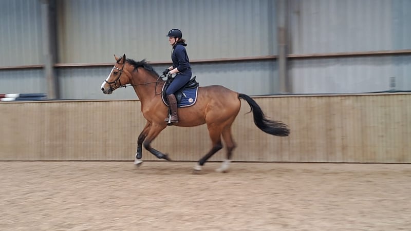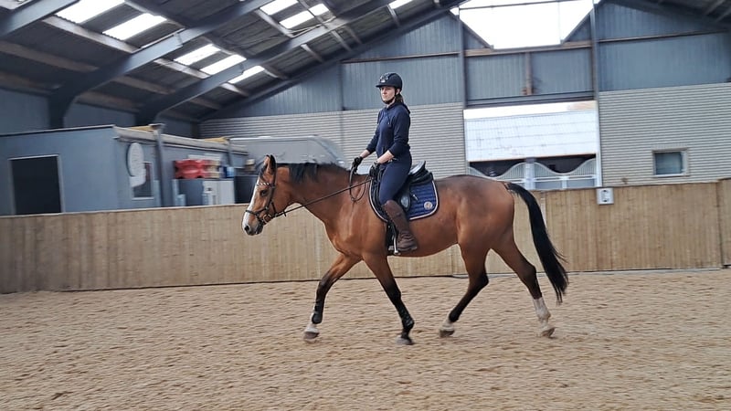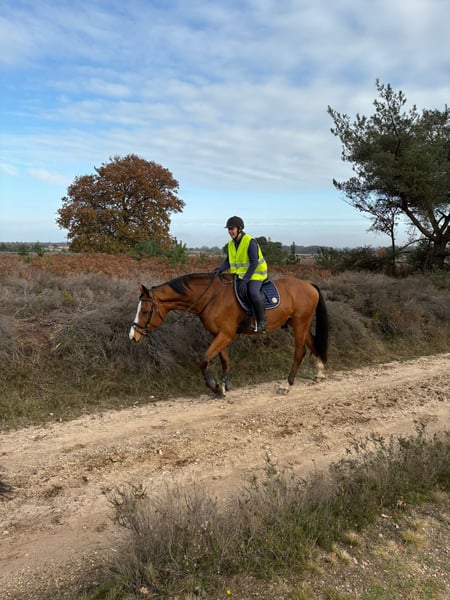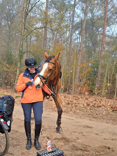If you're looking for a ready-made horse, keep searching! But if you're seeking a horse with whom you can grow together and who could become a lifelong companion, then read on 😀. Champ is an introverted, cheerful, sweet, and occasionally a bit unsure Holsteiner (sire: Chin Chin), 12 years old. He is happiest during the day; in the evening, he prefers to be relaxed and is especially fond of his food. His love for treats definitely goes through his stomach. He adores carrots. Due to his introverted nature, he needs more time to learn new things. This means more repetition. He enjoys learning! Both under saddle and in-hand, for example through groundwork. He will do his best for you if you give him the calm and time he needs. That makes him happy. He also really enjoys riding in the forest 😃. Apart from cows, which he doesn’t like, he is generally well-adjusted. He still needs some work to get used to them. He is traffic-proof and accustomed to trains. He has a spacious walk and trot; his canter is calm. He appreciates clear communication from his rider. He thrives on a consistent routine, as it helps him know what to expect, for example through calmness and regularity in his stable management. In the past, Champ experienced a trauma that caused him to lose trust in humans. I don’t know exactly what happened, but it mainly showed as tension when grooming and tacking up. We worked on this through groundwork and ESDR (Equine Stress-Displacement-Resilience), helping him to open up and relax. We’ve made good progress. This can also occur under saddle in the indoor arena, where he might tilt his head slightly. If you can calm him, this behavior usually subsides. Outside, he generally doesn’t show this. He loves being treated by the osteopath. He has received his annual vaccinations and a dental check-up, and behaves well during these procedures. He is sensitive to stomach ulcers. After a short veterinary treatment, this has been well managed by giving him GastriComp, especially during autumn and winter. He benefits from warmth and appreciates a warm blanket with a neck cover on colder days. We also introduced trailer loading with ESDR, which he initially found a bit stressful, similar to moving in small spaces. Now, he loads properly and stands calmly at the wash station. Champ is currently shod on the front, as his right front hoof tends to chip a bit. He visits the farrier approximately every 8 weeks. At his previous home, he once bucked under saddle, but I never attempted this myself because I was too unsure. Since I still feel a bit insecure myself, I haven’t been able to give him that final relaxation he needs. If you’re able to help him find that calm, you will have a lifelong friend! Offered at a friendly price of €4,500.