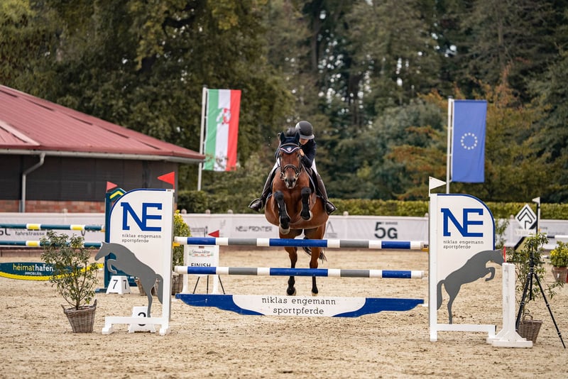 In the course over the colorful poles, Felix feels at home. He thrives in this environment and is full of motivation. In handling, Felix is always composed; nothing can easily unsettle him. He loads onto the trailer without any issues, behaves well for the farrier and veterinarian, and educates our young ones with friendly consistency in the open stable. Felix is familiar with life in a herd in an open stable, as well as box housing. For a relaxed ride at a walk or a sporty gallop through the woods, Felix is easily persuaded. But most of all, he loves to jump with fresh forwardness, which must be allowed, and with a scope and speed that makes hearts race. Those who want to be at the front in a jump-off have found the perfect partner in crime with Felix. If you would like to meet Felix in person or learn more, feel free to send a WhatsApp or SMS in advance!
