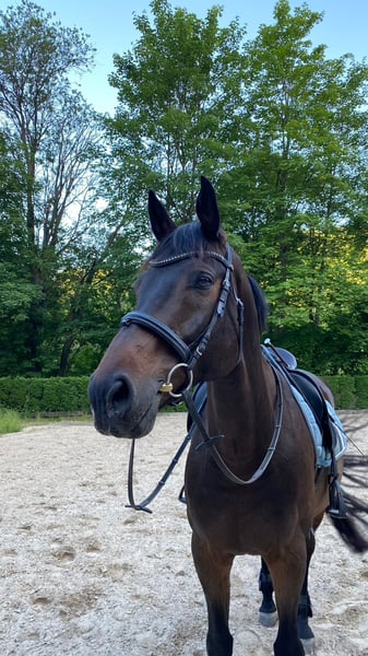 Wir verkaufen unseren Wallach Queck. Queck ist ein 15 jähriger Holsteiner und ca.174 cm gross. Aufgrund einer ausgeheilten Verletzung darf er nicht mehr springen, ist aber seit über einem Jahr wieder dressurmässig mit viel Spass zu reiten, was ihn zu einem super Pferd für ambitionierte Freizeitreiter*innen macht. Er ist sehr fein an der Hand und angenehm zu sitzen, und kennt von der Hilfengebung her auch noch viele Lektionen, die sich mit Training und mehr Kondition wieder erarbeiten lassen. Er läuft super an der Doppellonge, hat viel Spass bei der Bodenarbeit, und geht in Begleitung entspannt ins Gelände. Er ist sehr menschenbezogen und möchte gefordert, beschäftigt und betüddelt werden. Trotzdem ist er alles andere als ein Anfängerpferd. Er kann – je nach Tagesform - sowohl im Umgang als auch unterm Sattel ziemlich schwierig sein. Aus Erfahrung tritt dies bei regelmässiger und ausführlicher Beschäftigung mit ihm weniger auf. Genau dieses „Zeit mit ihm verbringen“ kommt bei uns leider gerade wegen Zeitmangel etwas kurz, weshalb wir ihn auch verkaufen möchten. Auf jeden Fall muss man selbstsicher und geduldig sein, sich nicht an der Nase herum führen lassen und sich auch nicht von seinen Clownereien - weder vom Boden noch im Sattel - beeindrucken lassen. Queck steht im Moment bei uns im Offenstall und das wünschen wir uns auch in Zukunft für ihn, da er so viel ausgeglichener ist. Aber auch eine Paddockbox mit tagsüber Koppelgang könnten wir uns für ihn vorstellen. Queck ist kein Notverkauf, und es gilt für uns definitiv Platz vor Preis. Passender Dressursattel (und evtl weiteres Zubehör) ist inclusive. Zur Beantwortung von Fragen und für mehr Details meldet euch einfach unverbindlich.