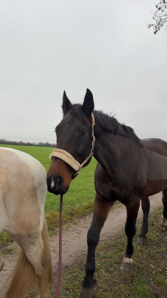 Ich verkaufe meinen 17-jährigen Holsteiner Wallach Conner. Er stammt ab von Contendro I x Langenhagen und hat ein Stockmaß von circa 1,78cm. Ich habe ihn selbst erst seit April 2025. Er ist mir sehr ans Herz gewachsen, aber er wurde mir als Anfänger verkauft und er braucht definitiv erfahrene Hände. Darum muss ich ihn leider abgeben. Er hat eine sehr liebe Seele und einen ruhigen Charakter. Er ist sehr aufmerksam, was vor allem Stimmkomandos angeht und lässt sich da super vom Boden mit arbeiten. Ob longieren oder Freispringen, er ist sehr fleißig und liebt Bewegung. Wurde früher bis M in der Dressur geritten wird aber nur noch als Freizeitpferd gearbeitet und verkauft. Er ist vom Grundsatz sehr fein zu reiten und bringt einen sehr anspruchsvollen Schwung mit. Er ist außerdem ein sehr schlauer Kopf und ließt sowohl den Reiter sehr genau und steigt hinter Muster und Wiederholungen sehr schnell hinter. Er hat aufgrund seiner Erfahrungen in der Dressurarbeit ein Verhalten beim Reiten entwickelt, an dem ich aktuell arbeite, aber eben an meine Grenzen komme. Er bleibt während des Reitens gern stehen und steht dann. Nur durch Treiben von einer weiteren Person am Boden läuft er weiter. Steigen, bocken macht er allerdings nicht. Er wird hauptsächlich mit gebissloser Trense geritten, da er das viel besser annimmt als eine normale Trense. Kennen tut er das aber auch. Allein geht er nicht gern ins Gelände, mit anderem Pferd oder einer Person ist das allerdings möglich. Auch als Handpferd macht er sich super. Er sieht gern überall Gespenster und braucht Zeit sich an neue Umgebungen zu gewöhnen. Besonders Kühe findet er nicht so witzig. An der Hand ist er da allerdings auch entspannter als mit Reiter. Alles bezieht sich eben auf meine Erfahrungen als Reiter. Ich kann sagen, wie er da vor dem Kauf war mit anderen Reitern. Er ist außerdem Verladefromm und läuft barhuf. Wird regelmäßig geimpft und entwurmt. Er wird nicht in reine Boxenhaltung abgegeben, nur Offenstall oder offenstallähnliche Haltung, da er Pseudonarkolepsie hat. Wir haben einen sehr guten Umgang damit gefunden und er weißt auch nicht die dafür typischen Verletzungen auf. Ich suche jemanden, der mehr Erfahrungen und Möglichkeiten hat ihn zu fördern. Er ist ein sehr schlaues Köpfchen, welches schnell hinter Aufgaben steigt. Er braucht viel Abwechslung und einen erfahrenere/n Person/Reiter, der das Händeln kann. Er macht unglaublich Spaß zu reiten und zu arbeiten, aber ich bin ihm mit meinen Fähigkeit und Hilfsmöglichkeiten einfach nicht gewachsen. Er hat einen angefertigten Dressursattel, der erst im April von Sattler kontrolliert wurde. Dieser kann bei Interesse gern zusätzlich miterworben werden. Es ist kein Notverkauf. Bitte nur ernsthafte Anfragen. Und es gilt definitiv Platz vor Preis! Ich bin ebenfalls unter 0174/2305087 zu erreichen.