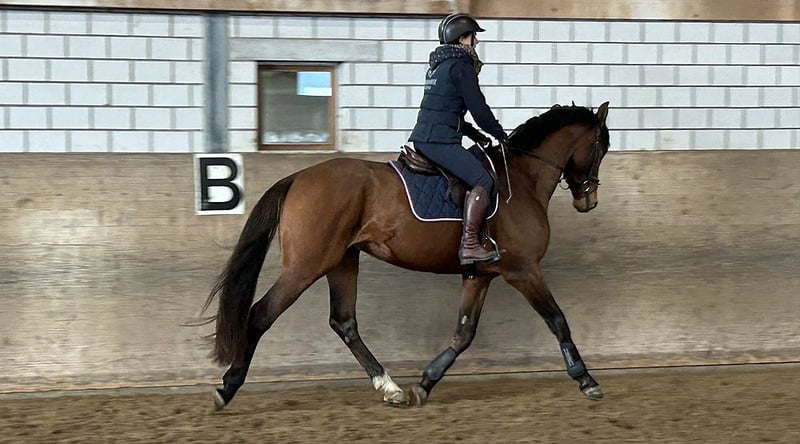 Lauriel Larimar × Caretino, foaled on May 28, 2022, Holsteiner gelding. He is currently being gently backed and can be seen in the video during his very first free jumping session. Holsteiner Olympic bloodline 741 (including Cardento, Leandro, Colorit, Click and Cash, Quintender, Coreandro). First free jumping and turnout in the arena and on the paddock. His dam is full sister to the 2018 licensed Holsteiner stallion Coreandro, who has competed successfully up to 1.45 m under Gerrit Flücken. His sire, Larimar, has produced several internationally successful offspring competing up to 1.60 m, including Lord Mexx, Larisal, Deleyn, and Ligretto.