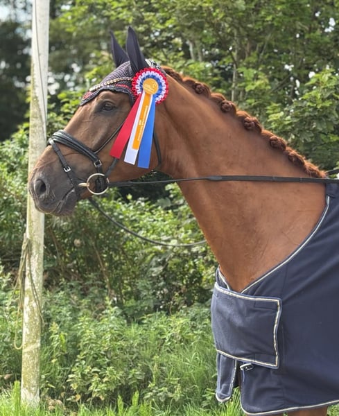 Alter: 5 Jahre (2020) Größe: ca 1,75 m Abstammung: Florett Ass x Limbo Ausbildungsstand: Dressurpferde A siegreich, beginnend mit den Lektionen der Dressurpferde L, AKU: Röntgenbilder sowie eine Klinische vom Oktober ohne gravierende Befunde vorhanden. Zum Verkauf steht ein traumhaft schöner 5-jähriger Sohn des Florett Ass mit herausragender Qualität und bester Erfolgstatistik. Er überzeugt mit einem überragenden, taktsicheren Schritt mit enormem Übertritt, einer beeindruckenden Bergauf-Galoppade und einer ausdrucksstarken Trabmechanik. Er hat ein Herz aus Gold, ist im täglichen Training ebenso wie auf dem Turnier äußerst unkompliziert und brav. Dabei ist er sehr schön und einfach zu reiten. Aktuell befindet er sich auf dem Weg zur Klasse L. In Dressurpferdeprüfungen der Klasse A ist er mehrfach siegreich und hoch platziert mit Noten bis 8,3. Geht ebenso brav ins Gelände. Ein außergewöhnliches Nachwuchspferd mit exzellenter Qualität und erstklassigem Charakter. Unter Wert zu verkaufen da er einen Ton des Grades II hat, was ihn aber sportlich nicht beeinträchtigt. Ein Tuniervideo kann gerne über WhatsApp versendet werden. 0172/3423408