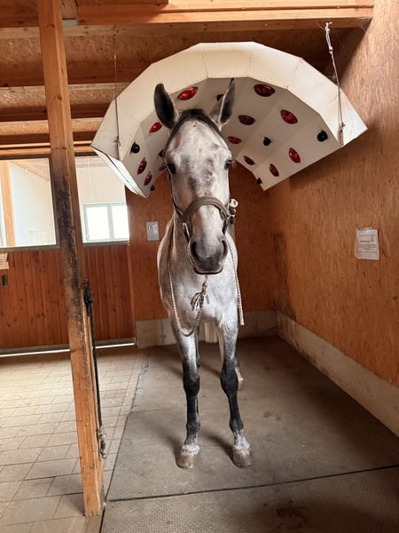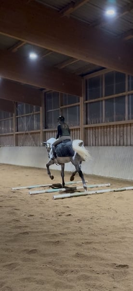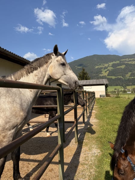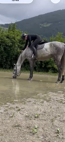 Crack HV x Baldini I x Capitol I Charlie has a heart of gold and is very affectionate. He also comes from an excellent pedigree. He is a sweet, young gelding that walks all three basic gaits calmly under saddle. He is gentle with unfamiliar riders; most recently, he was ridden by a 13-year-old girl. Charlie responds well to aids, is always eager to learn, and has never shown any ill intentions. He is very well-behaved in the field for his age, whether ridden alone or in a group. He is familiar with cats, dogs, sheep, and deer. Passing cars, tractors, or similar do not bother him. Charlie is very curious and brave, though he sometimes still needs reassurance from his rider. He has also been jumped under saddle and takes it very nicely; his first competition is already being planned. Due to his size, I have taken my time to avoid overwhelming him. Of course, Charlie has been regularly vaccinated and dewormed, and has received dental and chiropractic care. He is loading and shoeing friendly, although he has a Shivering Syndrome in his hind legs (which does not limit him). Sometimes he can be a bit impatient when being shod behind, but he is never malicious and has four iron shoes. If you show him understanding, he will cooperate willingly. Charlie has a slight X-legged conformation in front, but this does not restrict him either.