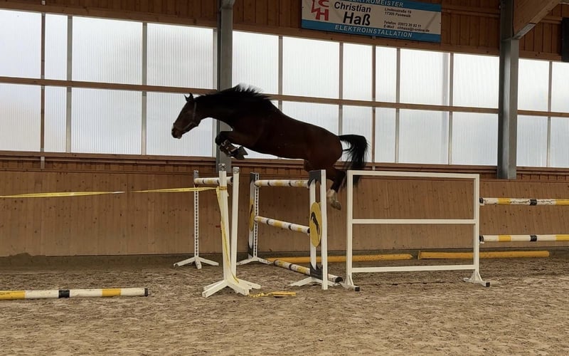 We are offering our Holsteiner gelding for sale. **Features:** - **Breed:** Holsteiner - **Gender:** Gelding - **Year of Birth:** 2019 - **Color:** Bay - **Height:** 17.8 hh Uriku only came into work last year due to his size and has competed in his first competitions this year. He has achieved several wins and placings up to A-Class and is ready to move on to L-Class. Uriku is easily adjustable forward and backward. He is suitable for an ambitious amateur rider or even more experienced riders. If you have any questions, please feel free to contact us.