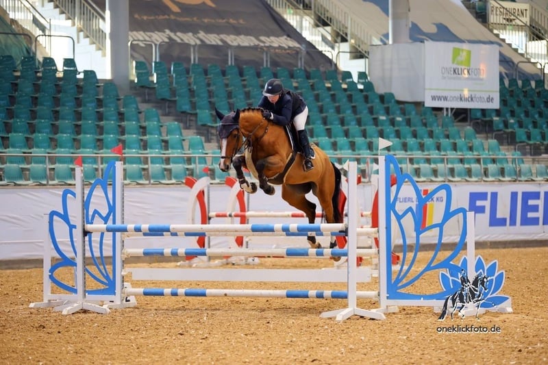 This modern, bloodlines-rich Million Dollar mare exhibits an impeccable character, great willingness to perform, and ambition in show jumping. She is equipped with talent, caution, and awareness at the fences. In the arena, she fights for her rider and strives to make everything possible over each jump. The mare has a very good scope with a flexible canter. She has achieved numerous successes in show jumping competitions up to class L during her first competition season. An ideal young competition horse for a sport-minded rider, amateur, junior, or young rider.