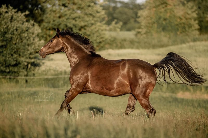 Sell an elegant Holsteiner gelding, born in 2017. The dark bay roan is very sensitive and not suitable for beginners. He is backed but very difficult to handle under saddle. He is extremely human-oriented and enjoys spending time with his handler. During ground work or walks, he proves to be very trainable and eager to learn. When riding out, it is best to do so in pairs, as he is a relaxed and brave companion. Nakari is accustomed to trailer loading but only with a second horse present; he prefers not to be alone in the stable. However, he does not need a second horse when being worked. He is familiar with the farrier and always has four shoes on in summer. He is kept in a small herd of three other horses.