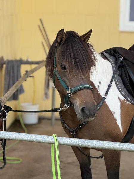 Poezja heißt die 8-jährige reinrassige Huzule-Braunscheckstute mit Abstammungsnachweis, die wir aus Zeitgründen verkaufen möchten. Sie ist in Polen auf einem Huzule Gestüt gezogen, wurde im Alter von 4 Jahren schonend angeritten und sorgfältig mit viel Liebe von einer Horsemanship-Pferdetrainerin, die immer noch regelmäßig mit ihr arbeitet, am Boden ausgebildet. Typisch für die Huzulen hat sie einen starken und eigenwilligen Charakter und braucht einen klaren Menschen, der die Pferdesprache versteht und spricht. Dann ist sie lernbereit und folgsam, was sie vor allem in der Bodenarbeit zeigt. Sie geht in Halle und Platz gut in den drei Grundgangarten, die sehr schön zu sitzen sind, da sie bedingt durch ihr Exterieur eher wenig Schwung in Trab und Galopp hat. Sie ist etwas vorhandlastig, woran man aber gut mit ihr arbeiten kann. Springen ist definitiv nicht ihre Disziplin, das gibt ihr Körperbau einfach nicht her (obgleich sie ein Cavaletti problemlos überspringt). Sie ist sanftmütig im Umgang, zeigt keine Verhaltensauffälligkeiten, lässt sich verladen, hat keine Probleme mit Tierarztbesuchen oder Hufpflege. Sie hat top Hufe und lief bei uns bisher immer völlig problemlos barhurf. Die Hufe sind gesund und extrem widerstandsfähig mit gesundem Strahl und anatomisch korrekter Stellung von Natur aus. Sie hat keine organischen Probleme und hat bei uns noch nie gehustet. Sie hat kein Ekzem und schubbert sich nicht. Da sie zur Gewichtszunahme bei Futter ad libitum neigt, sollte sie hier begrenzt werden. Die Zähne wurde vor kurzem von der Dentistin gemacht und als unauffällig befundet, die Osteopathie kommt alle 6 Monate zum Check (zuletzt im August 2025). Sie ist regelmäßig entwurmt und gegen Tetanus geimpft. Poezja ist kein reines Kinderpony. Wenn sie eine gewisse Führungsschwäche "ihres" Menschen bemerkt, übernimmt sie vor allem im Gelände selbst die Verantwortung, was dann eine gewisse Fluchtbereitschaft erzeugt. Sie folgt dann auch schon mal ihren Impulsen, was ein erfahrener Pferdemensch aber gut in den Griff kriegt. Ein Durchgeher ist sie definitiv nicht, auch bleibt sie nicht einfach stehen. Sie bemüht sich immer um Kooperation, hat jedoch einen starken, rasse- und aufzuchtbedingten Instinkt und sie checkt daher stets ihr Umfeld auf Gefahren hin. Und wie jedes Pferd ist sie nicht gerne alleine, was sie u.U. auch deutlich zeigt. Sie akzeptiert dabei jedoch stets die Umzäunung, ist kein Zaungeher. Sie braucht einen ruhigen, selbstsicheren Erwachsenen mit guter Pferde(sprachen)erfahrung. Ich könnte sie mir jedoch auch gut als Reitschulpony auf einem liebevollen Reiterhof vorstellen, denn sie läuft in bekannter Umgebung und in der Reithalle extrem brav und zuverlässig an der Longe und auch frei unterm Reiter. Sie geht sehr sanft mit Kindern um und zeigt hier keine der gefürchteten "Pony"-Verhaltensweisen wie z.B. Bocken oder absichtliches Streifen der Bande. Mit anderen Pferden geht sie sozial unauffällig um, sie ist gruppenfähig und kann gut sogar im geschlechtergemischten Offenstall gehalten werden. Man kann auch mit ihr züchten (reinrassige Huzule mit Abstammungsnachweis), sie ist aktuell jedoch nicht als Zuchtstute eingetragen. Sie kann noch bis August 2026 bei uns bleiben und (aber nur vor Ort) auch getestet werden vom potentiellen Käufer.