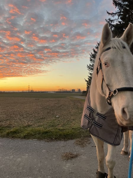 Ich suche schweren Herzens ein neues Zuhause für meinen wunderschönen, unfassbar gutmütigen, jungen und verspielten Wallach Nanouk. Durch die Geburt meines Sohnes kommt er leider einfach zu kurz. Da die Suche nach einer Reitbeteiligung nach über einem Jahr erfolglos war, bleibt mir nur übrig diesen Schritt im besten Interesse des Tieres zu gehen. Nanouk ist bei seiner Vorbesitzerin Springturniere gegangen, hat dabei auch sehr viel Freude, ist aber eher ein gemütlicher und auf Grund dessen wünsche ich mir für ihn ein Zuhause fernab vom Turniersport. Er ist ein kleiner Riese, kennt seinen Körper aber noch nicht so richtig und benötigt hier noch etwas Unterstützung. In der Dressur ist er in allen Grundgangarten gut ausgebildet, darf hier aber noch weiter gefördert werden. Nanouk ist auch schon mit Kindern in ein paar Reitstunden unterwegs gewesen und war hierbei stets bemüht. Ich suche dennoch ein Zuhause, wo er nicht im Schulbetrieb gehen muss. Er ist im Geländer sehr brav, sowohl vom Boden aus, als auch beim Reiten. Man kann mit ihm stundenlang durch die Gegend dümpeln und die Seele baumeln lassen. Kennt Hunde und Kinder. Er ist vorne beschlagen, hinten kommt er ohne Eisen zurecht. Er ist sehr Menschen bezogen, sehr verschmust und bindet sich an seine Besitzerin (ich nenn ihn immer liebevoll meinen Schoßhund) Er steht derzeit in einem Offenstall mit drei anderen Pferden und ist der Herdenchef, allerdings nur auf Grund der mangelnden Führungsqualität der anderen. Im vorherigen Stall war er im Mittelfeld. Er ist ein recht sensibles Pferd, die richtige Haltung ist enorm wichtig, dass er sich entspannen kann und sich wohl fühlt. Es fällt mir unheimlich schwer mich von Nanouk zu trennen, aber ich möchte ihm die Chance auf ein Zuhause, wo er richtig gefördert wird nicht nehmen. Ich habe keinen Zeitdruck beim Verkauf und es ist mir sehr wichtig die richtigen Menschen zu finden. Ich verkaufe ihn nur in ein Zuhause mit Offenstall oder sehr großer Box mit ganztägigem (egal bei welchem Wetter) großflächigem Koppelgang. Was ich mir wünsche? Einen Menschen, der sein Herzenspferd sucht, der einfach gerne Zeit mit dem Pferd verbringt, wo Know-how vorhanden ist und Nanouk vielseitig trainiert wird. Da er auf Grund mangelndem Training nicht in seinem besten körperlichen Zustand ist und wieder Muskulatur aufbauen und Kondition bekommen muss, wird er unter Wert verkauft. Ich kann gerne Reitvideos bei Interesse zusenden. Er bekommt sein gesamtes Zubehör mit. Halfter, Decken, maßgefertigter Sattel (!), Kappzaum, etc.