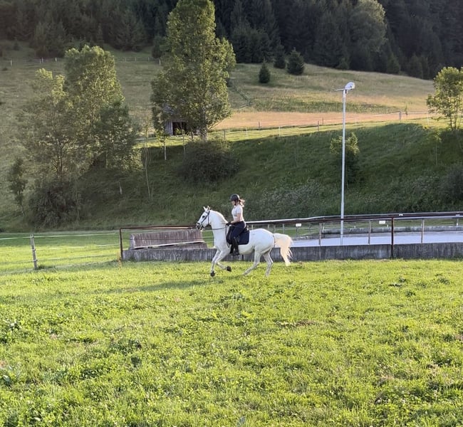 Incitato Dani, liebevoll von mir Lippi genannt, ist ein 2011 geborener Lipizzaner Wallach. Er wird bei mir freizeitmäßig auf dem Platz geritten und vom Boden aus gearbeitet. Am Reitplatz ist er nicht schreckhaft und zeigt eine solide Grundausbildung. Besonders die Bodenarbeit bereitet ihm großen Spaß, und er ist stets bemüht, Neues zu lernen. Gelegentlich springen wir auch über kleine Hindernisse, wobei uns beiden die Erfahrung und Sicherheit fehlt. Derzeit steht Lippi in einer Paddock-Box und kommt tagsüber mit seinen Pferdefreunden auf einen Auslauf oder die Weide. Er ist ein extrem soziales Pferd, liebt es, mit anderen zu spielen, und ist gut verträglich. In der Rangordnung hält er sich eher im mittleren bis unteren Bereich auf. Lippi wurde regelmäßig geimpft, entwurmt, und seine Zähne wurden stets gemacht. Er ist an allen vier Hufen beschlagen. Beim Ausreiten ist Lippi etwas unsicher und orientiert sich gerne an anderen Pferden, jedoch ist auch das Alleine-Ausreiten kein Problem. Er geht auch ins Wasser und steigt auf den Anhänger. Lippi benötigt eine Bezugsperson, auf die er sich verlassen kann. Sobald dies der Fall ist, geht er mit einem durch dick und dünn. Aufgrund privater Veränderungen habe ich mich entschlossen, ihm ein neues Zuhause zu suchen. Da er mir aber sehr am Herzen liegt, gilt hier absolut Platz vor Preis! Er ist kein Anfängerpferd, da er eine Bezugsperson benötigt, die ihm Sicherheit gibt. Lippi wird mit dem gesamten Zubehör abgegeben (Sattel, Trense, Decken, etc.). Wir freuen uns auf ein Kennenlernen!