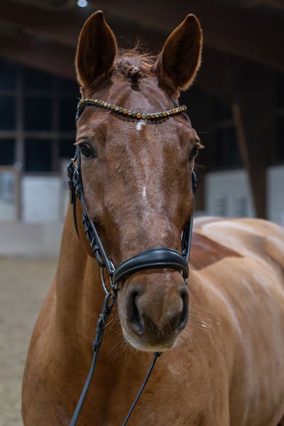 For sale is Balvenie, a 10-year-old chestnut mare. Balvenie is competing up to medium-level dressage on double bridle. She has significant potential for advanced classes. She has already begun training in S-class movements, including series changes up to two-tempi changes (not yet always perfectly executed). Her most notable feature is her lively trot, with a strong aptitude for piaffe and passage. In show jumping, she also impresses with placings up to A-class, although she has not been further developed in this discipline. Additionally, Balvenie reliably goes out on trail rides, both alone and in groups. She is forgiving and gentle, even with younger or less experienced riders. As a foal, she was awarded a premium, making her also an interesting prospect for breeding. In daily handling, she is very straightforward: she is farrier-friendly, loading-friendly, calm at the vet, and overall very gentle to handle. She is compatible with mares and geldings in our herd. No vices such as cribbing or weaving are known. Balvenie is an honest, well-trained mare with excellent prospects for an ambitious dressage rider. A breeding certificate from 2025 is available. Video to follow! For serious inquiries, Balvenie can be ridden in a test ride by appointment. Mobile: 0173/4619382 (Mon-Fri from 3 pm, available all day on weekends)