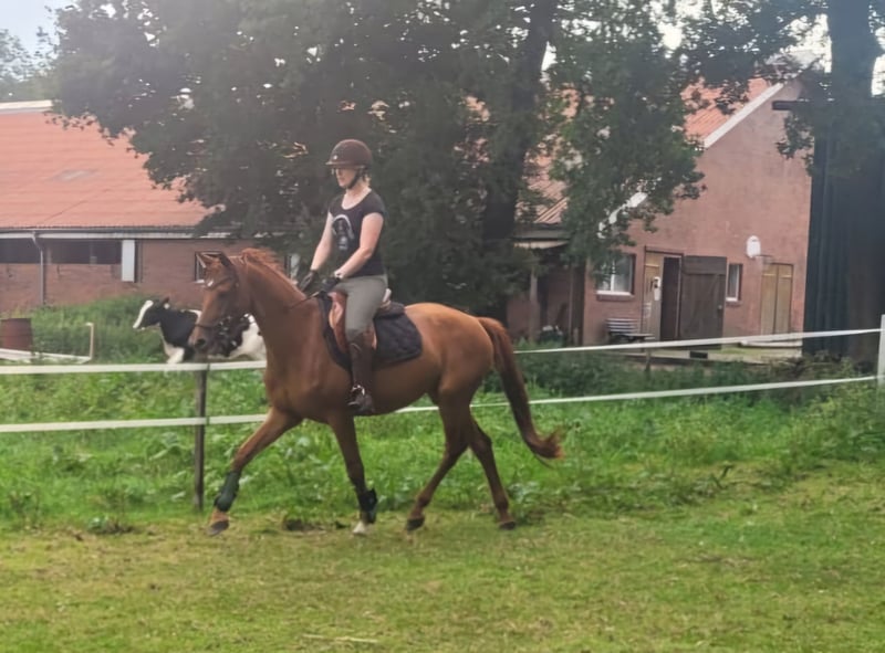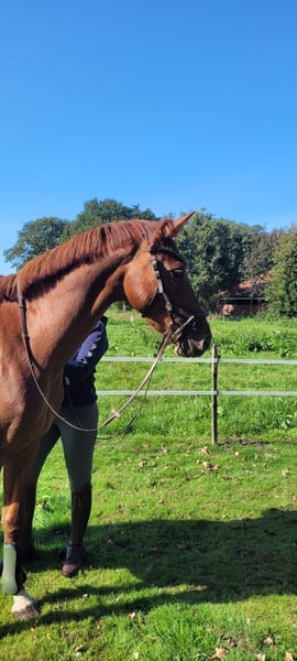 5jährige ca. 161cm große Stute von Sanches RT(v. Special Effekt x Incolor x Levantos) x Condelaro (V.Contender) x sandro Song x Almeo. Smira ist eher schmal und im Vollbluttyp stehend, sie hat seht gute Grundgangarten. Sie ist brav im Umgang, schmiede-und verladefromm, sehr intelligent, mutig und neugierig. Sie hat Freude am Freispringen und Stangenarbeit. Sie springt einen kleinen Pacours und zeigt sich dabei sehr konzentriert und engagiert. Sie steht noch ganz am Anfang ihrer Ausbildung und ist unterm Sattel schwierig. Sie testet ihren Reiter immer wieder, deshalb ist sie nicht für Anfänger geeignet. Da sie leider zu stark für mich ist, muss ich sie abgeben. Aus diesem Grund und aufgrund eines Schönheitsfehler ( große Narbe am Karpalgelenk), wird sie weit unter Wert abgeben. Preis VHB bei schneller Abwicklung.
