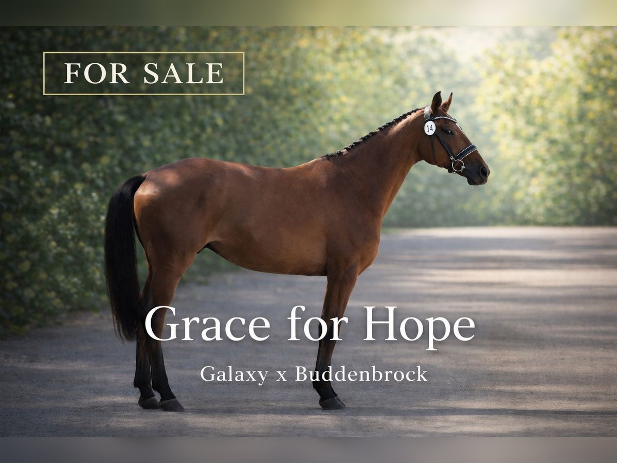Die von mir selbst gezogene 6- Jährige Stute von Galaxy (Grand Galaxy Win x Sir Sinclair) aus einer Buddenbrock x World Cup I – Mutter besticht mit viel Charme und Schmelz. Stets kontaktfreudig und mit positiver Arbeitseinstellung, wird sie schonend geritten und ausgebildet und ist insbesondere als „Damenreitpferd“ interessant. Zudem hat sie 3 Jährig die Stutbuchaufnahme erfolgreich absolviert und ist in das mecklenburgische Zuchtbuch eingetragen. Neben der dressurmäßigen Arbeit kennt sie insbesondere auch das Freispringen, die wöchentliche „Gymnastikarbeit“ unter dem Reiter und saisonale Ausritte bis hin zum Strand. Erwähnenswert ist auch, dass ich mit der Mutter von Bundesnachwuchschampionat über mehrfache Teilnahmen an Deutschen Jugendmeisterschaften bis hin zu Erfolgen in der Klasse S geritten bin. Die Stute steht lediglich aufgrund der Größenverhältnisse zum Verkauf. Mit ihren 1,65 m ist sie leider für mich (1,80m) zu klein. Da der Fokus derzeit auf meinem Amateurpferd liegt, erfolgte bisher auch keine Turniervorstellung. Zur Zeit wird die Stute auch von einer Reitbeteiligung betreut. Bei Interesse oder weiteren Fragen gerne eine WhatsApp an 01775894870 oder per PN.