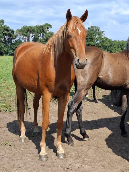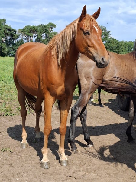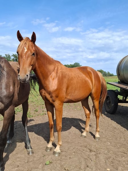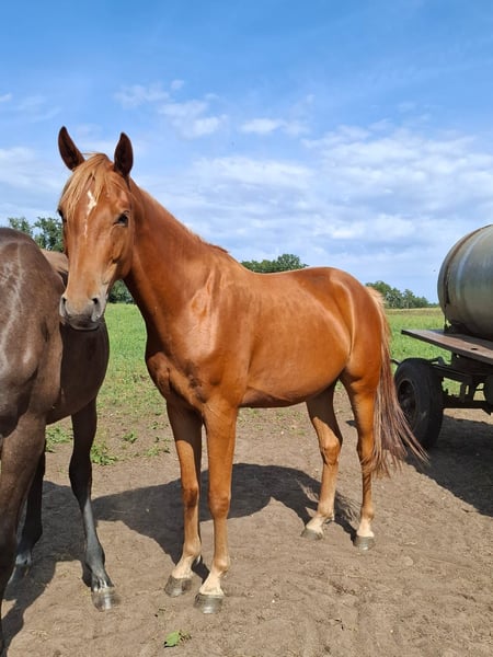 **Sales Advertisement: Mecklenburg Warmblood Gelding by Chacfly PS out of a Quintus Gold x Landrebell Mare** For sale is a beautiful Mecklenburg Warmblood gelding, born in 2022. With an impressive height of 165 cm and his striking chestnut color, he is truly a head-turner. This talented gelding shows great potential in jumping, thanks to his lineage. He is characterized by his friendly and open nature, making him an ideal partner for both sport and leisure. He is well-handled and easy to work with. If you are interested or would like more information, please feel free to contact me. Don't miss this opportunity to acquire a promising sport partner!