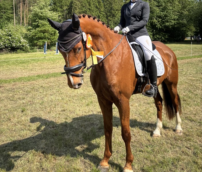 Aus Zeitmangel aufgrund meines Studiums steht mein 7 jähriger Wallach „Benno“ zum Verkauf. Er ist ca. 1,75m und deckt somit auch größere Reiter/innen sehr gut ab. Er befindet sich auf einem soliden A-Niveau in der Dressurarbeit. Im Parcours zeigt er sich auch stets motiviert und das regelmäßige Freispringen bereitet ihm viel Freude. Er zeigt dort Übersicht und ist stets ehrlich am Sprung. Auch, wenn der Fokus in unserer täglichen Arbeit nicht auf dem Springen liegt, wird Benno trotzdem regelmäßig mit Stangen gearbeitet. Er geht brav in der Gruppe ins Gelände und ist natürlich absolut Schmiede- und verladefromm. Lies sich bislang von alt bis jung reiten. Auch unter Reitanfängerinnen zeigte er sich sehr gelassen und brav. Ein wenig Turnierluft konnte er bereits schnuppern und verhielt sich dort jungpferdgerecht. Auch an einigen Lehrgängen auswärts hat er bereits teilgenommen. Benno ist ein richtiger Kumpeltyp und liebt es lange verwöhnt und umsorgt zu werden. Dem Menschen gegenüber ist er nie böse. Ich würde ihn als artiges Pferd bezeichnen, der mit seinem jungen Alter ab und zu nochmal etwas grün hinter den Ohren ist, aber stets händelbar bleibt und viel Quatsch mitmacht. Volti würde bisher einmal angetestet (siehe Fotos) dort zeigte er sich sehr brav und aufgeschlossen. Die Zähne wurden im Februar 2026 nochmal gemacht. Eine AKU aus 10/2023 liegt vor, eine aktuelle kann auf Wunsch und gegen Kostenübernahme gemacht werden. Wir freuen uns auf eure Nachrichten und beantworten gerne offene Fragen