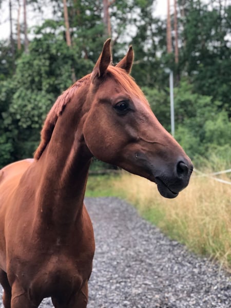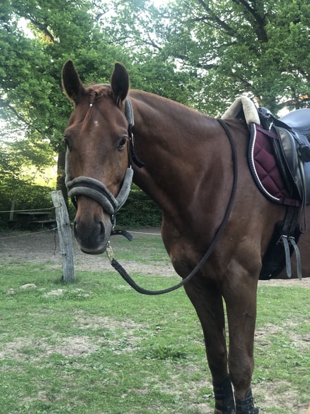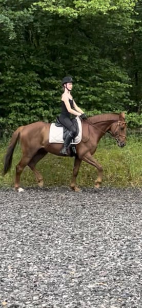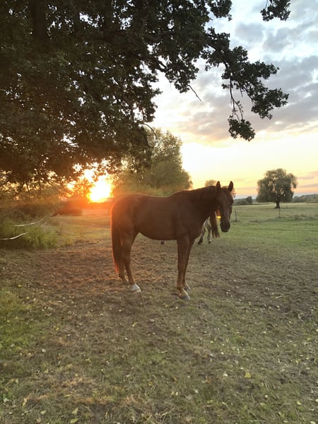 Upcoming videos will follow! For sale is Dacapo, an 8-year-old warmblood gelding with an excellent pedigree (D’Egalité x Quaterback). He stands approximately 16.1 hh and impresses with his friendly, willing nature and great potential for dressage, leisure riding, and small jumps. Dacapo has been under saddle for just over six months and has always been well-behaved—no vices, no bucking, no rearing. He is familiar with trail riding both in a group and alone. Currently, he lives in a large herd in an open stable, but he is experiencing too much stress there, which is why I have made the difficult decision to place him. He would likely settle better in a smaller herd or box stall with regular turnout. Dacapo needs a confident, calm handler who can provide him security and lead him consistently—then he is truly a dream horse with a lot of heart. We are still working on his relaxation, but once the stress is gone, progress will be quick, and he will be able to focus again on correct contact and connection. He is healthy, barefoot, has never been ill, and only has three small equine sarcoids, which are currently being treated successfully and are barely visible.