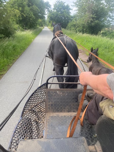 Esra has been with us since she was a foal and has grown up in a herd among her peers! She is a premium foal herself, which she has passed on, and this year she produced a 4-year-old foal that won at the foal show with movement scores of 9.0, which the foal impressively repeated at the foal championship. She herself is equipped with top-class basic gaits, has a great character, and always has the right attitude towards work! This was clearly evident when working with her, as she can be ridden without any issues and is easy to harness for single driving. Esra is blacksmith-friendly and load-friendly, as well as free from any quirks or bad habits.