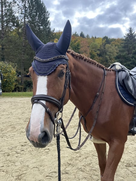 This beautiful chestnut mare, approximately 1.75 meters tall, impresses with her charm, expressiveness, and balanced temperament. She is very rideable and pleasant to ride in both show jumping and dressage. She particularly excels in the cross-country phase — demonstrating great scope, good technique, and the necessary caution. In handling, she is always well-behaved, uncomplicated, and friendly, making her an excellent choice for ambitious leisure riders or amateurs. Under saddle, she proves to be reliable and easy to manage — a mare that brings daily joy with her willingness to perform and her honest character. She also remains calm and fearless in the terrain and is absolutely straightforward and well-behaved when loading, trimming, or at the blacksmith.