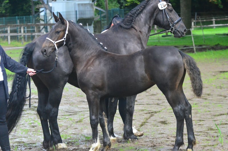 This pretty black filly named Gretchen is looking for a new home starting at the end of October. She was born healthy and lively on March 26, 2025. She knows the basics of foal training and behaves very well with the farrier. Gretchen has a nice movement with a relaxed trot despite her solid build. Her height is expected to be around 165 cm. She has a good pedigree and would therefore also be interesting for breeding later on. At the foal show on August 2, 2025, she received a foal premium. If you are seriously interested, getting to know her is no problem.
