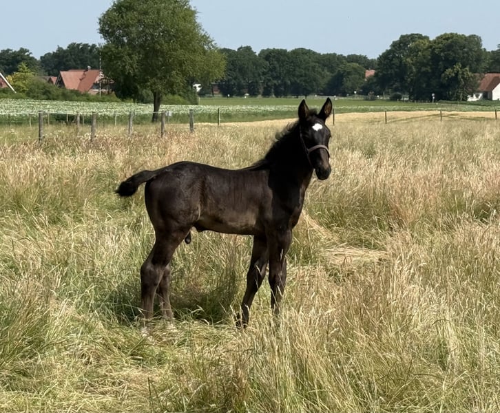 Zum Verkauf steht ein außergewöhnliches Alt-Oldenburger Hengstfohlen in beeindruckender Rappfarbe – geboren 2024. Vater ist der bewährte und ausdrucksstarke Rappe Dankwart, die Mutter stammt aus der linienstarken Verbindung Basta/Deport. Dieses Pedigree vereint Leistungsbereitschaft, Charakterstärke und Typvollendung in idealer Weise. Das Fohlen überzeugt durch: • Kräftigen, korrekten Körperbau • Ausdrucksstarke, schwungvolle Bewegungen mit natürlichem Gleichgewicht • Er hat ein menschenbezogenes, zahmes Wesen – bereits halfterführig • Gute Erziehung durch Aufzucht im Herdenverband – hervorragend sozialisiert • Ehrlicher, klarer Charakter – geprägt durch das ruhige, zuverlässige Wesen beider Elterntiere Egal ob Zucht, Freizeit oder späterer Sporteinsatz – dieses Fohlen bringt alles mit, um seinem neuen Besitzer viel Freude zu bereiten.
