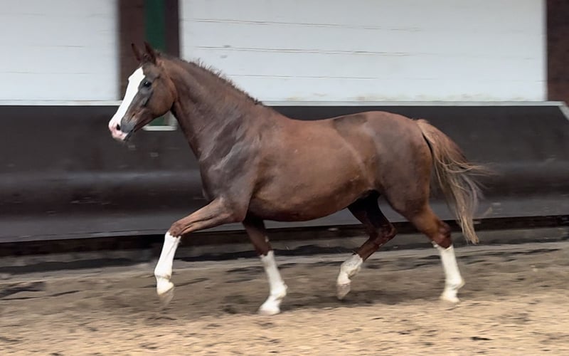 Mooie, kleurrijke, 4x hoog witte, dubbel geplaatste merrie, drachtig voor 2025 van de al even kleurrijke dubbelvererver, kampioenshengst en HLP winnaar Cafe au lait, die al enkele jaren de aandacht trekt met zijn ongelooflijk succesvolle nakomelingen in de dressuur- en springsport op gevorderd niveau. Ze verwacht volgend jaar ook een veulen via embryotransplantatie van de onlangs goedgekeurde Cafe au lait nakomeling "Cafe's Don Rubin"! Beide hengsten zijn homozygoot donker, er kan geen vosje vallen. De jongere volle broer van de merrie is al succesvol op medium dressuurniveau en andere broers en zussen van dezelfde moeder zijn succesvol op gevorderd dressuurniveau. Ze was zelf reservekampioen op de veulenkampioenschappen en is extreem sterk in beweging! Staat in hengstenmodel, met veel hals en een vlekkeloze bovenlijn! Cafe au lait kan schitteren met een aantal dubbel getalenteerde nakomelingen: Cafe's "Casimir" (Cafe au lait x Calido x Grannus) was de gevierde hoofdprijswinnaar op de Oldenburg Elite Auction, was op jonge leeftijd al seriewinnaar bij de medium (M) dressuurpaarden en was als 7-jarige opnieuw seriewinnaar bij zijn eerste dressuurwedstrijden op gevorderd (S) niveau! Hij zegeviert nu in internationale Intermediaire I klassen. Kasselmann's merrie Cafe's Caletta (Cafe au lait x Calato) heeft ook al dressuurwedstrijden op gevorderd (S) niveau en internationale Grand Prix gewonnen. Cafe's Matts (Cafe au lait x Don Frederico) was het op één na duurste dressuurpaard op de Oldenburger Summer Mixed Sales. Andere jonge paarden uit springgeörienteerde fokmerries hebben zich al meerdere keren geplaatst in proeven voor jonge dressuurpaarden op gevorderd (A) tot middelbaar (M) niveau en zijn opvallend sterk bewegend en helder van geest. Het lijdt geen twijfel dat de Cafe au lait nakomelingen overtuigen in de springsport tot op gevorderd niveau. De gekeurde Cafe's Champus was Vice Wereldkampioen jonge paarden onder Rene Tebbel en staat ook bij ons ter dekking. Ook gekeurd en uit ons fokprogramma: Cafe Junior (Cafe au lait x Silvio I), internationaal geplaatst in springwedstrijden op gevorderd (S*) niveau, Cafe's Columbo (Cafe au lait x Belstaff), succesvol in Frankrijk. Cafe au lait zelf was finalist in het Bundeschampionat onder Philipp Weishaupt en is succesvol geweest tot en met gevorderd (S***) niveau in de springsport, maar heeft ook drie spectaculaire gangen en is opgeleid tot en met gevorderd (S) niveau in de dressuursport. Hij is gestationeerd bij Paul Schockemöhle en heeft al een aantal internationaal succesvolle springpaarden gebracht, waaronder "Royce", die de FEI CSI5* $500,000 Rolex Grand Prix Wellington won. Onze veulens krijgen dagelijks mineraalvoer en veulenstarter, regelmatig EQUISTRO Haemolytan en Ipaligo Foal, ontwormen en een hoefsmid zijn ook vanzelfsprekend. De moederdieren krijgen ook speciaal merrievoer tijdens de dracht, dagelijks sapvoer en lijnzaadolie, en hooi ad libitum. Dit zorgt ervoor dat onze nakomelingen altijd in optimale gezondheid verkeren! Meer veulens en nakomelingen uit ons eigen fokprogramma op aanvraag. Sommige zijn te vinden onder de andere advertenties. Elk jaar hebben we ongeveer 20 veulens van Cafe au lait en Cafe's Don Rubin. Video aanvragen etc. vooraf alleen mogelijk via Whats App.