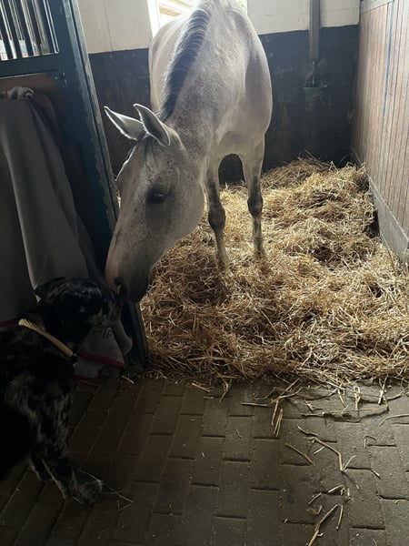 This 10-year-old grey mare has been in my possession since her foalhood. At age 8, she competed successfully in S-Class show jumping and has remained clear in M* and M** classes this year as well. She enjoys being ridden and lunged, and she likes gymnastics work. She could potentially have a "second career" as a dressage horse, although she has not yet been introduced to dressage competitions. However, since she can sometimes startle and make a small side jump, she is not ideally suited for complete beginners. She is very well-behaved in handling and has no faults. Current X-rays are available.