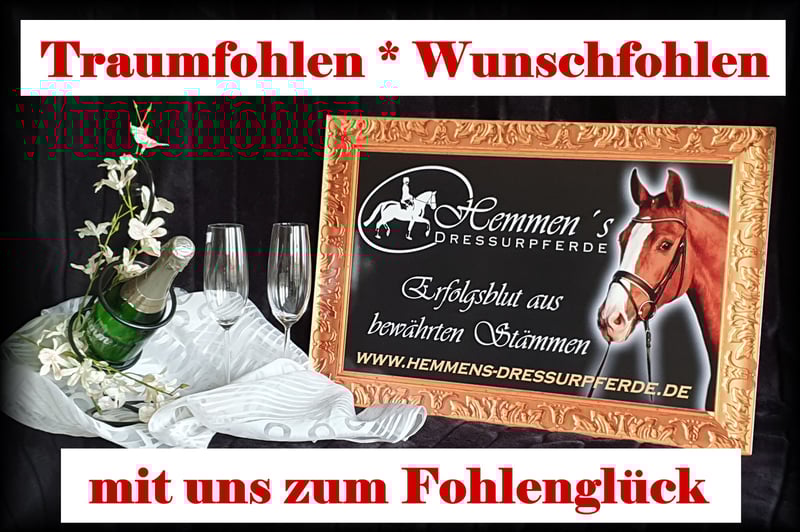 dein Traum-Hengst + unsere Stute = DEIN TRAUM-FOHLEN Bei uns haben Sie die Möglichkeit, Dressur-Stuten mit Erfolgs-Genetik mit ihrem Wunsch-Hengst anzupaaren. *WIR BIETEN IHNEN DRESSUR-BLUT AUS BEWÄHRTEN STÄMMEN* Überzeugen Sie sich von der Qualität unserer Zucht-Stämme auf: www.hemmens-dressurpferd.de Interesse ??? dann rufen Sie uns gerne an: +49 1757875438 Claudia und Burkhard Hemmen