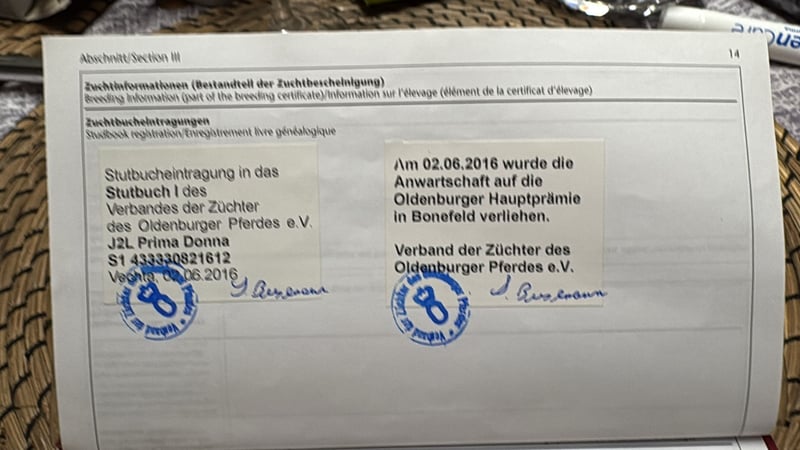 Yegua de cría, actualmente gestante de Zonik Plus. Nacida en 2012. Oldenburg. Yegua premiada por el Estado. Chagall x Soprano x Davignon. ¡Actualmente está en estado de gestación de Zonik Plus, campeón de Europa! Este año ha dado a luz un potro muy bonito de Pride. La yegua también ha obtenido colocaciones en doma hasta la categoría M y ha ganado jóvenes caballos con una puntuación de 8,0. Sin embargo, se vende como yegua de cría. Se vende por motivos de la dueña relacionados con la cría. Precio: 7.000 € VHB. El caballo actualmente se encuentra en Bélgica, cerca de la frontera alemana. Teléfono: 0031683948083 https://www.horsetelex.nl/horses/pedigree/1492919/j2l-prima-donna