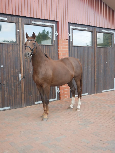 Cette jument fait probablement partie des dernières générations du légendaire De Niro. Freya est née en avril 2013 et a passé la inspection de performance des femelles en août 2016 avec une note pondérée de 7,44. Ses allures de base ont été évaluées à 7,5 chacune, et le cavalier externe lui a attribué un 8,0 pour le sang-froid. Depuis lors, elle fait partie de notre élevage et, en huit saisons de reproduction, elle a donné naissance à sept foals. Elle est actuellement gestante de Krügerrand, station Pape/LG Celle, pour la mi-mars 2026. En tant que réserviste de la sélection d’Oldenbourg en janvier 2025, il suscite de grandes attentes. Fils de Kingston JZ, il est par Don Olymbrio ou Don Schufro, issu de la lignée Cabana. Dans les quatre premières générations, on trouve dix étalons ayant connu un succès international. De cette lignée de la ligne Feldgold proviennent également Laudate Dominum, Sexy Back, Skyla, Ferrari Girl, Faszination Frieda et bien d’autres.