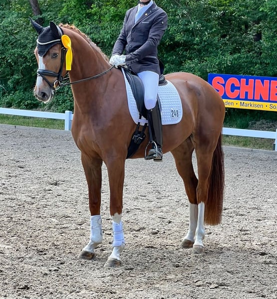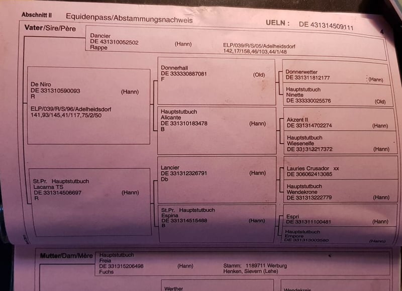 Pregnant for March by the exceptional stallion Secret from Sezuan. A mare that can be confidently paired with modern young stallions. She brings size, a solid foundation, correctness, and an outstanding character. She also passes on an excellent walk, a performance-oriented and mentally clear attitude, and is simply straightforward in all aspects. Her offspring can be found in dressage, as well as her half-siblings. Dressage bloodlines from Graphit, Werther, Lauries Crusador xx, and De Niro adorn her pedigree. Donna’s brother, Del Arte, has achieved success in S-level dressage with Katja Willers. Donna’s dam, Freia, is a sister to the S-level dressage winner Get Smart by Golfclub/Elisa Abeck. The maternal line also includes stallions Abermals and Abzug, both by Abdulla. She has already produced auction candidates and elite foals. Donna suffers slightly from arthritis in the hind legs, but this in no way limits her. She has also been ridden. She has always been kept in an open stable with other mares, which is best for her. Of course, she will go to the foaling stall when the time comes. Phone: 017632574900
