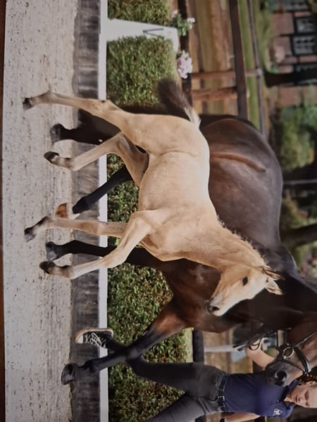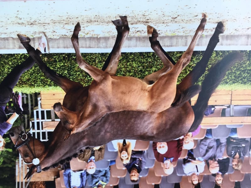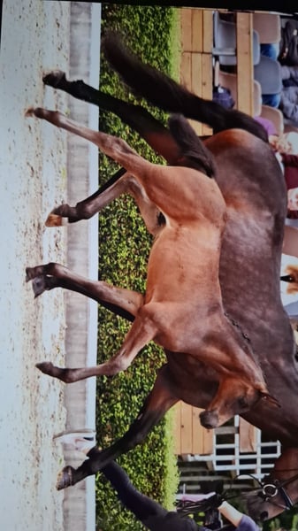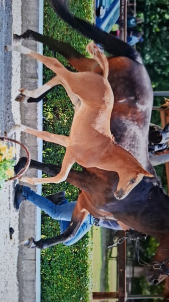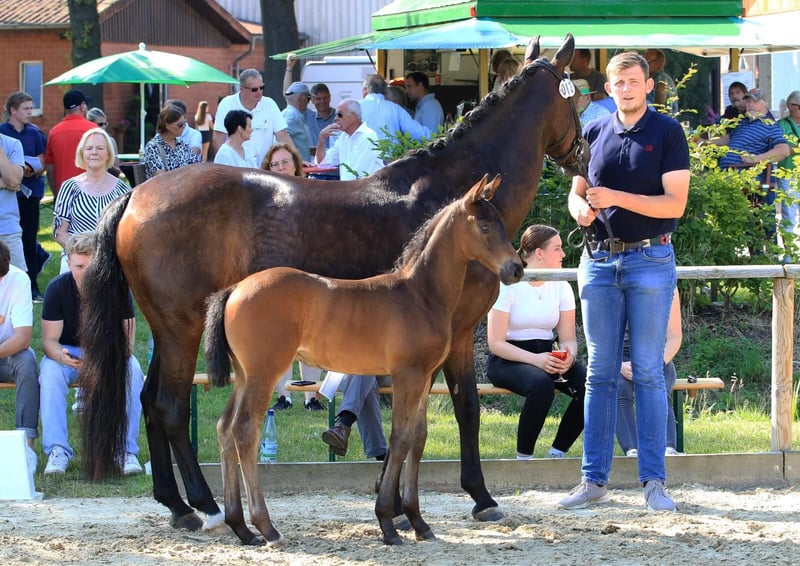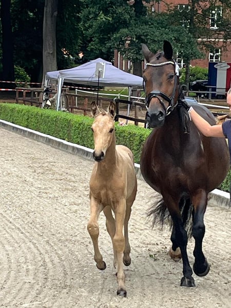 This mare combines the significant Trakehner family of Herbstzeit (T14O3) with the sought-after Rudilore line. She is in foal to the Westphalian state stallion and ZfdP champion stallion Robert DeNiro junior for 4/26. She easily accepts both in foal heat and the subsequent heat. She has been inseminated with both fresh semen and frozen semen. So far, she has managed every birth on her own and is a very good mother. She is being sold due to offspring. She has an uncomplicated temperament. High-ranking in the herd but still easygoing with new horses.