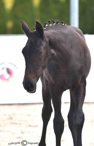 Very noble, eye-catching not only because of her type but also due to her correct conformation and, most importantly, her light, elastic movement, the filly My Lady Adventure achieved high scores at the VI Open Foal and Noble Horse Championship in Radzionków. The judges appreciated her modern, sport-oriented type and build, but mainly her trot and canter movements. This should not come as a surprise when one considers her rich pedigree, full of valuable genetics. Her ancestors shone not only in dressage arenas but also in show jumping competitions worldwide. Her sire is the Oldenburg stallion ESCANTO PS – German 4-year-old Dressage Champion, twice champion of the stallion test, and winner of the Main Premium at the stallion licensing. He carries the genes of the outstanding sire Escamillo, to whom he bears a strong resemblance, and he passes these traits strongly to his offspring – a wonderful, harmonious build and nearly perfect proportions for a dressage horse. Escanto is a true athlete, with expressive strength and stamina, unwavering rhythm in his gaits, and a natural ability for self-carriage. The mare line is equally valuable. Her fourth dam, Gardenia, competed in show jumping at CC1 level and participated in the Polish Senior Championships. She is half-sister to notable jumpers such as Garnizon (licensed stallion, competing at 140 cm), Gandia, who excelled in 145 cm show jumping, and another licensed stallion, Grom, who had a career jumping at 130 cm. My Lady Adventure descends from the valuable family of the mare Georgia uszl.x (by Bezimienny brdbg), which was mainly bred at the Moszna Stud, and later also at SK Prudnik. The number of successful horses from this lineage, especially in show jumping, is very high. Notable include jumpers such as Gino (CC3 class), Gitta (MPMK-B), Grog (130 cm), Goldmara (145 cm), Gostera (130 cm), Gardes G (140 cm), Grog (130 cm), Gig (150 cm), Gayall (135 cm). One cannot forget the phenomenal, epoch-making racehorse Galerius (by Jape xx), who ran and won steeplechase and hurdle races—30 wins out of 39 starts, with 2 second places and 2 third places. He earned a total of PLN 120,356. Within this family, there are also eventing horses: Gio Candio, winner of MPMK-C in the 4-year-old category, Green Light M, Garda (CCI*), and Graal (CNC* level), as well as many licensed stallions—Grog, Gig, Gastin, Gorset, Gregory, Gayall, Grom, and Gladiolus M. The dam’s sire is the grey Hickstetstakkato, son of the well-known stallion Hickstead White, a 155 cm class horse, winner of the Grand Prix (150 cm) in Linz-Ebelsberg/AUT, the Large Round in Wiener Neustadt/AUT, and Lichtenvoorde/NED. The filly is very friendly, eager to approach people. She has been trained to accept legs, grooming, hoof care, bridle fitting, and leading. She is familiar with the blacksmith. During the summer, she is kept in a free-range mode with a shelter, but she adapts easily to stable life. The filly has been weaned from her mother and is ready for collection. Instagram video link https://www.instagram.com/reel/DObWkqVjOtw/?igsh=MW1qOXlqa3VyanYxbg== Second video link https://www.instagram.com/reel/DOmJROPDPQ5/?igsh=aDB5cjRzdHM1OG42 Link to the video and evaluation from the Oldenburg foal premium event https://www.instagram.com/reel/DOmKk_sDCVe/?igsh=dGpsZzZkOXg0OGNx