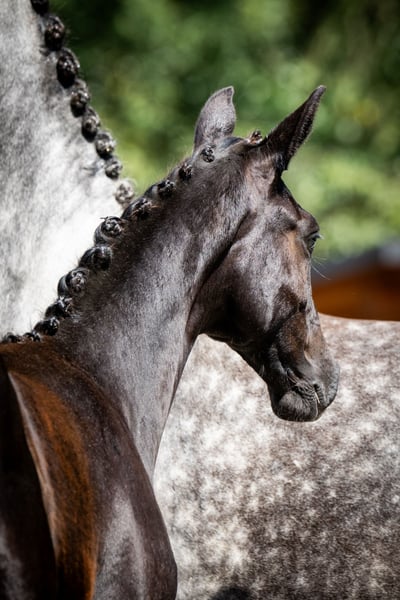 Sehr edle, auffällige Stute, die nicht nur durch ihren Typ, sondern auch durch ihre korrekte Anatomie und vor allem durch ihre leichte, elastische Bewegung besticht. My Lady Adventure erzielte hohe Bewertungen beim VI. Offenen Fohlen- und Hengstchampionat der Edlen Rassen in Radzionków. Die Richter lobten ihren modernen, sportlichen Typ, ihre Erscheinung sowie vor allem ihren Trab und Galopp. Dieser Erfolg überrascht nicht, wenn man ihr reichhaltiges Pedigree mit wertvollen Genen betrachtet. Ihre Vorfahren glänzten nicht nur auf Turnierplätzen, sondern auch in internationalen Springhallen. Ihr Vater ist der Oldenburger ESCANTO PS – Deutscher Meister der 4-jährigen Reitpferde, zweifacher Champion des Hengsttests und Gewinner der Hauptprämie beim Körungsturnier. Er trägt die Gene des herausragenden Vererbers Escamillo, dem er sehr ähnlich ist, und gibt diese Eigenschaften stark an seine Nachkommen weiter – eine wunderschöne, harmonische Konformation und nahezu perfekte Proportionen für den Dressurviereck. Escanto ist ein wahrer Athlet mit expressiver Kraft und Tüchtigkeit, beständigem Rhythmus in den Gangarten sowie natürlicher Fähigkeit zur Selbsthaltung. Ebenso wertvoll ist die weibliche Seite ihres Pedigrees. Ihre vierte Mutter, Gardenia, startete im Springen bis zur Klasse CC1 und nahm an den polnischen Meisterschaften der Senioren teil. Sie ist Halbschwester zu Springpferden wie Garnizon (anerkanntes Hengst, bis 140 cm), Gandia, die erfolgreich bis 145 cm sprang, sowie einem weiteren lizenzierten Hengst, Grom, der eine Karriere im Springen bis 130 cm vorweisen kann. My Lady Adventure stammt aus einer wertvollen Familie der Stute Georgia uszl.x (nach Bezimienny brdbg), die vor allem in der Zuchtstation Moszna, später auch in SK Prudnik, aufgewachsen ist. Viele ihrer Nachkommen haben auf Springturnieren Erfolge erzielt, darunter Gino (Klasse CC3), Gitta (MPMK-B), Grog (130 cm), Goldmara (145 cm), Goster (130 cm), Gardes G (140 cm), Gig (150 cm), Gayall (135 cm). Nicht zu vergessen ist das phänomenale, epochale Rennpferd Galerius (nach Jape xx), das 39 Rennen bestritt, 30 davon gewann (!), zweimal Zweiter und zweimal Dritter wurde. Insgesamt erzielte es Preisgelder in Höhe von 120.356 zł. In dieser Familie wurden auch Vielseitigkeitspferde wie Gio Candio, Sieger der MPMK-C bei den 4-Jährigen, Green Light M, Garda (CCI*) und Graal (nach CNC*) gezogen, ebenso zahlreiche lizensierte Hengste: Grog, Gig, Gastin, Gorset, Gregory, Gayall, Grom und Gladiolus M. Der Hengst der Mutter ist der silbergraue Hickstetstakkato, ein Sohn des bekannten Hengstes Hickstead White, eines 155 cm großen Pferdes, das u.a. die Große Runde in Wiener Neustadt/AUT, Lichtenvoorde/NED sowie das Grand Prix (150 cm) in Linz-Ebelsberg/AUT gewann. Die Stute ist sehr freundlich, geht gerne auf Menschen zu. Sie ist an das Handling gewöhnt: Beine heben, Putzen, Satteln, Trense anlegen und Longieren. Sie ist mit dem Schmied vertraut. Im Sommer steht sie in einem Freilaufstall mit Unterstand, kann aber auch problemlos im Stall gehalten werden. Sie ist bereits entwöhnt und bereit zur Abholung. Link zum Video auf Instagram https://www.instagram.com/reel/DObWkqVjOtw/?igsh=MW1qOXlqa3VyanYxbg== Zweites Video https://www.instagram.com/reel/DOmJROPDPQ5/?igsh=aDB5cjRzdHM1OG42 Video und Bewertung zur Oldenburger Prämierung https://www.instagram.com/reel/DOmKk_sDCVe/?igsh=dGpsZzZkOXg0OGNx