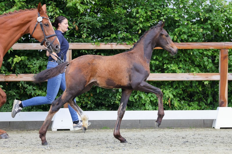 Elegant Oldenburg Filly for Sale We are offering a beautiful Oldenburg filly, born in 2025. She impresses with her dark coat and distinctive markings. She comes from a line with an impressive height potential, with an estimated final height of around 17.4 hh. The mare is ideally suited for dressage and demonstrates considerable talent, supported by a promising dam line. She is healthy, well-mannered, and has a friendly temperament. Perfect for ambitious riders seeking a reliable partner for the dressage arena. Successful offspring from this line have achieved sale prices of up to €700,000. Please feel free to contact me for more information! I am happy to provide further details and arrange a viewing upon request.