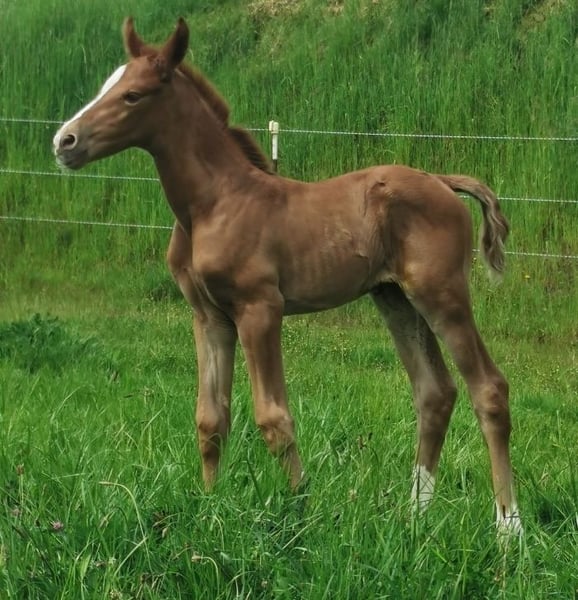 Tolle kräftige 2-jährige Stute mit entsprechendem Fundament von Belantis I-Sohn aus mütterlicher Outcrosslinie mit Sport- und Schauerfolgen! Beide Eltern haben eine gesunde Halswirbelsäule (kein ECVM oder Stufenbildung) wie auch die Stute selbst. Bestens geeignet für Sport und Zucht, da sehr geringer Inzuchtkoeffizient. Ihr Vater Brahmshofs Baju (Rappe) ist ein Belantis I-Sohn, gesund und mit bestem Charakter. Er wird von einer Para-Reiterin dressurmäßig geritten und hat rittige, kopfklare nervenstarke Nachzucht. Ihre Mutter stammt ab vom Weltmeister der jungen Springpferde Quicksilber, eine weitere Tochter (Quadra 2) geht S-Springen! In nächster Generation folgt bestes Shagya-Araberblut über Pamino (12 gekörte Söhne) verbunden mit einer der besten Stutenlinien der erfolgreichsten privaten Shagya-Araberzucht Europas. Aktuell (noch nicht ganz 2 Jahre) ist Mathilda 160 cm groß, sie wird ein Endmaß von ca. 168 cm erreichen. Trotz Schimmelmutter sieht alles so aus, als wenn sie Fuchs bleibt und kein Schimmel wird. Mathilda ist eine top Option sowohl für den Sport (von Amateur bis Profi) und ist aufgrund ihrer Genetik hervorragend zur Zucht geeignet!