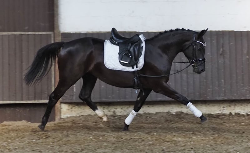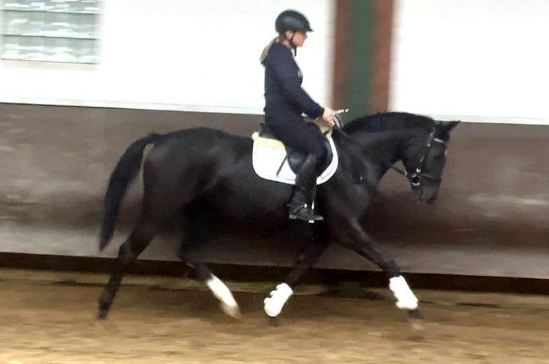 Eine weitere bildschöne bewegungsstarke 2,5jährige Tochter des Kör- und HLP-Siegers "Cafe au lait", der schon seit einigen Jahren durch seine unheimlich erfolgreiche Nachzucht im Dressur- und Springsport der schweren Klasse auf sich aufmerksam macht! Sowohl durch den Vater als auch durch die züchterisch erprobte und beidseitig veranlagte Mutter, die zudem auch über den nötigen Blutanschluss verfügt, empfiehlt sich diese elegante lackschwarze Stute für den Dressur- und Springsport, sowie den Vielseitigkeitssport gleichermaßen. Beim Freispringen überzeugt sie auf ganzer Linie durch unheimlich viel Übersicht, Vorsicht und Vermögen! Zwei ausgesprochen qualitätsvolle Vollgeschwister sind bereits verkauft und ebenfalls sehr bewegungsstark und springtalentiert! Diese schicke Stute steht im mittleren Rahmen, Stckm. zur Zeit 1,61m, Endmaß ca. 1,64m, daher das ideale Damen- und Juniorenpferd. Deckt sehr gut auch größere Reiter ab. Da sie im Dezember 22 geboren ist, zählt sie offiziell zum Jahrgang 23. Altersentsprechend wird sie zur Zeit angeritten und zeigt sich dabei absolut artig und leichtrittig. Auch von schwächeren Reitern zu händeln. Selbst im Dunkeln kann man mit ihr spazieren reiten. Cafe au lait selbst war unter Philipp Weishaupt Bundeschampionatsfinalist und ist bis S*** Springen erfolgreich gewesen, ist aber auch mit drei sehr guten GGA ausgestattet und dressurmäßig auf S Niveau ausgebildet worden. Stationiert bei Paul Schockemöhle zeugte er schon etliche international erfolgreiche Springpferde, u.a. "Royce", siegreich im FEI CSI5* $500,000 Rolex Grand Prix Wellington. Der aus unserer Zucht stammende gekörte Cafe's Champus wurde unter Rene Tebbel Vizeweltmeister der jungen Pferde. Ebenfalls alle gekört und aus unserer Zucht: Cafe Junior (Cafe au lait x Silvio I), international S*-Springen platziert. Cafe's Columbo (Cafe au lait x Belstaff), erfolgreich in Frankreich. Cafe`s Star (Cafe au lait x Calido I): gekört und S-Springen erfolgreich im Iran. Cafe's Don Rubin (Cafe au lait x Donnerhall), siegreich in seinen ersten Springpferdeprüfungen, 4jährig als jüngstes Pferd Bronze beim Dobrocker Deisterchampionat Weitere Jungpferde aus springbetonten Mutterstuten sind bereits mehrfach in Dressurpferdeprüfungen A bis M platziert und sind bemerkenswert bewegungsstark und kopfklar. Auch im großen Viereck überzeugen die "Cafe's" auf ganzer Linie: So wurde Cafe's Casimir" (Cafe au lait x Calido x Grannus) gefeierte Preisspitze der Oldenburger Eliteauktion, war bereits in jungen Jahren Seriensieger in Dressurpferde M, 7jährig in seinen ersten S- Dressuren wieder Seriensieger! Mittlerweile ist er in S** und international Intermediaire I siegreich. Stute Kasselmanns Cafe's Caletta (Cafe au lait x Calato) ist ebenfalls bereits S-Dressur und international Grand Prix siegreich. Cafe's Matts (Cafe au lait x Don Frederico) wurde Vizepreisspitze bei den Dressurpferden der Oldenburger Summer Mixed Sales. Alle Nachkommen zeichen sich durch hohe Rittigkeitswerte, Traumcharakter und Doppelveranlagung aus! Unsere Fohlen bekommen täglich Mineralfutter und Fohlenstarter, regelmäßig EQUISTRO Haemolytan und Ipaligo Foal, Wurmkuren und Schmied sind natürlich ebenfalls selbstverständlich. Auch die Muttertiere bekommen die ganze Trächtigkeit hindurch spezielles Stutenfutter, täglich Saftfutter und Leinöl, sowie Heu ad libitum. So ist unsere Nachzucht stets im besten Gesundheitszustand! Weitere Fohlen und Nachwuchspferde aus eigener Zucht auf Anfrage. Ein Teil ist unter den anderen Anzeigen zu finden. Bei uns fallen jedes Jahr um die 20 Cafe au lait Fohlen. Es stehen auch immer wieder einige tragende Zuchtstuten zum Verkauf. Cafe`s Rosemarie verfügt bereits über aktuelle sehr gute Röntgenbilder. Videoanfragen vorab ausschließlich via WhatsApp möglich.