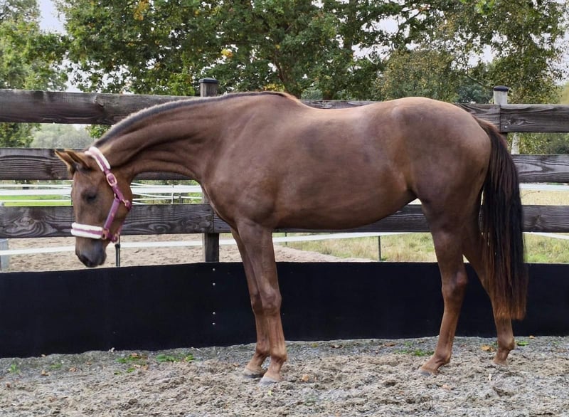 Beautiful, unbroken mare Dark chestnut Born April 20, 2023 (2.5 years old) Current height: 16.1 hh Premium foal award recipient Dynamic Dream x StPrSt Quantensprung x Caprimond x De Niro 👉 From the Caprimond dam line of Zonik Plus – winner in the Grand Prix Special at CHIO Aachen 2025🥇 Dam: Quantensprung x Caprimond x De Niro 👉 State premium mare with an overall mare performance test score of 8.4!!! Breeding evaluation 6/7. The dam was auction top at Klosterhof Medingen as a foal (€38,000). Sire: Dynamic Dream (Dream Boy – Sir Donnerhall I) Winner of the Westphalian licensing (€1.9 million) and HLP champion in Denmark. Owned by Helgstrand Dressage. Dynamic Dream is one of the most sought-after sires of his generation across Europe. His progeny includes numerous licensed sons and auction toppers like Dynamic Heart (€90,000) and Dynamic in Black (€74,500). Dam line: Oldenburg line 140 / Majorin III (by Graf – Gaudy – Gessler – Falko – Macro) – Day and Night by De Niro (Grand Prix, Bianca Ramcke) – Elite Quality Time by Quantensprung (S**, Jaya Gutheil) – Macron by Morricone I (S*, Julia Schönherr) – Quel Plaisir by Quantensprung (M**, Jens Harig, MS-Handorf 2016) – Million Dollar Baby by Millennium (M**, Jessica Nikolay) – Zacchiato by Zackerey (L, VA 2022) – OLHPrA Mirabelle by Escamillo (L) – Dodilas by Danone II (L, VA 2011) – Dauntless by Danone I (L) – Led Zeppelin by Looping (show jumping 1.40 m, Richard Kummer) – Luna by Luxius (show jumping 1.30 m, Kerstin Ilbertz) – Pik Loverboy by Pik Bube I (show jumping M, Wilhelm Brechters) Performance-tested stallions: Beniro (PB Oldenburg), Cabinett (Ldb. Moritzburg), Clever and Smart (Ldb. Zweibrücken, PB Westf.), Compagnon (PB Mecklenburg), First Promise (PB Netherlands), Friedo (PB Oldenburg), Fugato (PB Baden-Württemberg), Gordius, Inpello (PB Oldenburg, RhPfS), Lindgren, Lurioso (PB Westf.), Zico (PB Denmark, Oldenburg) International show jumpers: Atlantis 131 / Sven Schlüsselburg Cat Ballou 8 / Heinrich-Hermann Engemann Santander S / Angelica Augustsson (SWE) Farrier, dewormed, everything as it should be, sound, excellent character, human-oriented. Please feel free to contact me via private message if interested.