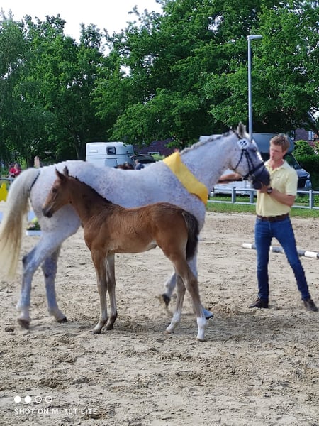 Mare, born in 2022 Winner foal by Ostfriesland From the dam line of Jugendzelt and the family of Goldfever. She is the granddaughter of Goldfever's full sister. Her half-brother is competing in the USA under Tara Ardalan, and other siblings have been sold abroad, including Portugal. The mare has been backed but has no show jumping experience yet, as we wanted to wait until she finished growing. Her basic gaits are similar to those of Goldfever II, making her suitable for dressage, and she could also be used as a versatile all-rounder. Due to herd reduction, she is offered at a very attractive price. She is a Hannoverian and has been accepted into the Hannoverian jumping horse program.