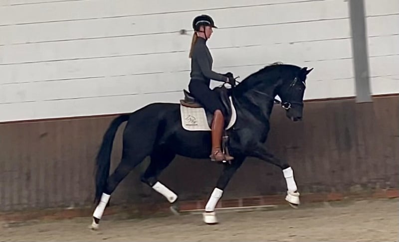 Dear prospective buyers, If you have any questions or would like to make an appointment, please send us a WhatsApp or e-mail. You can reach us by phone WERKDAYS and preferably around noon. If this is not the case, please send us a message and we will get back to you. We look forward to hearing from you! "Wendy" is a beautiful young dressage horse in the coveted black jacket, who knows how to convince with her great quality and impeccable character. After just a short time under saddle, she is very rideable, smart and well-balanced. She always wants to do everything right and responds very well to rider aids. She has a very fine contact and is also very comfortable to sit on. She is also very uncomplicated to handle for a young horse. A horse with a great attitude and lots of quality for the future! Direct from the breeder. Good current MOT available.
