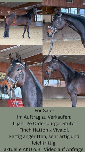 En venta por encargo: Yegua de 5 años de Oldenburger. A los 4 años fue brevemente montada. Desde hace más de 4 meses he tenido la oportunidad de montarla y seguir desarrollándola. Tiene un carácter absolutamente tranquilo y equilibrado. Es muy inteligente y sensible al contacto con la silla. Bajo la montura nunca ha mostrado miedo ni incomodidad. Quiere agradar al jinete y siempre está motivada para trabajar. También ha conocido el terreno y ha llegado incluso a cruzar agua. Actualmente está bastante equilibrada y prácticamente lista para su nuevo dueño.
