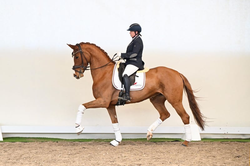 Juna Jackpot, a five-year-old mare with a modern sport horse type, captivates with power, elegance, and natural presence. Built uphill with elastic, flowing gaits and an expansive, uphill-carrying canter, she combines noble refinement with a striking appearance. Her honest, friendly character makes her a horse that impresses both under saddle and on the ground. Her pedigree reflects the best of modern dressage breeding: her sire Janeiro Platinum passes on elegance, refinement, and outstanding movement to his offspring. Her damsire Londontime, the legendary Hanoverian stallion and state stud sire at Celle, contributes rideability, willingness to perform, and numerous S-level successful progeny. The damline is further strengthened by Weltmeyer, one of the most influential dressage sires worldwide, renowned for exceptional mechanics, rideability, and a powerful hindleg. Juna Jackpot presents herself as a harmonious, willing-to-learn horse with natural self-carriage, uphill movement, and expressive gaits. A young mare who impresses through character, quality of movement, and refinement – ready to develop into an outstanding dressage partner.