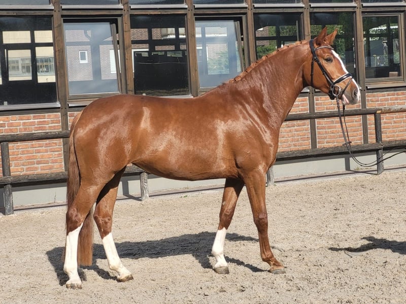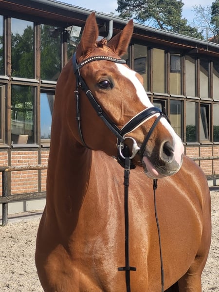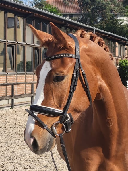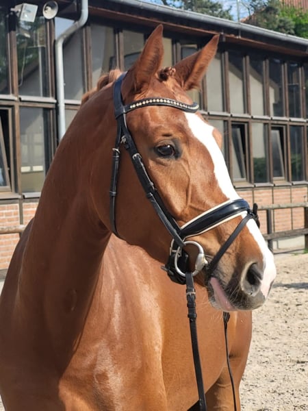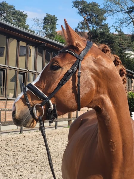 Daisy is a 4-year-old chestnut mare with excellent rideability, a super sweet character, honest, well-behaved, and yet eager to perform. She is now almost certain in Dressage Horse A and can be immediately used in riding horse competitions at tournaments. Daisy has plenty of forwardness when riding and is always focused during work, learns very quickly, and is 100% clear in her mind. Suitable for everyone. (For younger or less experienced riders, it is best to have support through lessons or training, as four-year-old horses are still learning themselves.) Due to the jumping genes inherited from her mother, she is also likely to be a great show jumper, although she has not been trained for this so far. Breeder's X-rays are available, and X-ray images can be sent via email. Feel free to arrange an appointment for a trial ride and to get to know her at 0176-20496034, also via WhatsApp. Both weekdays and weekends work well! Daisy is located at the Uhlerborn equestrian facility, Budenheimer Weg 41-45, 55262 Ingelheim district Heidesheim. (This is a private horse sale; the horse is privately owned, so no commercial dealer involved. The contacts for this advertisement are merely to be seen as contact persons, such as riders or caretakers of the horse, and are not the owners of the horse for sale.)