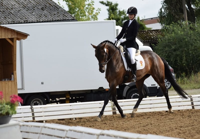 For sale due to a reduction in herd size: a wonderful, rideable Oldenburg mare by Jovian. Competent in dressage, having competed in Dressage Horse Class A and A-Dressage, with placements in A**-Dressage alongside a young girl. Strong mover, elegant, and well-behaved. L- level lessons have been initiated, and she is on the best path to progress to the next level. Ridden exclusively by amateurs. Experience with young horses is preferred. Easy to handle with other horses, familiar with children, farm machinery, etc. A fantastic horse for the upcoming season.