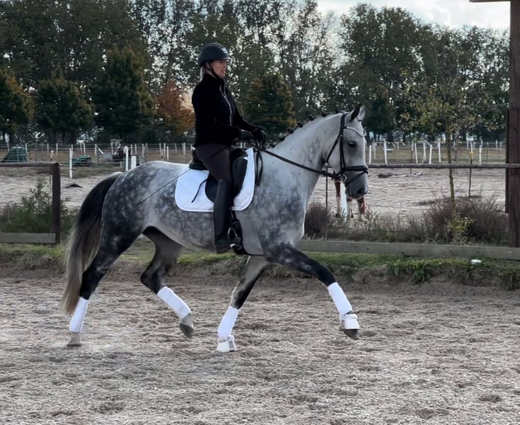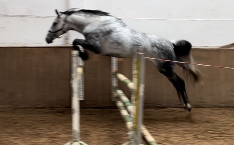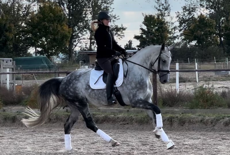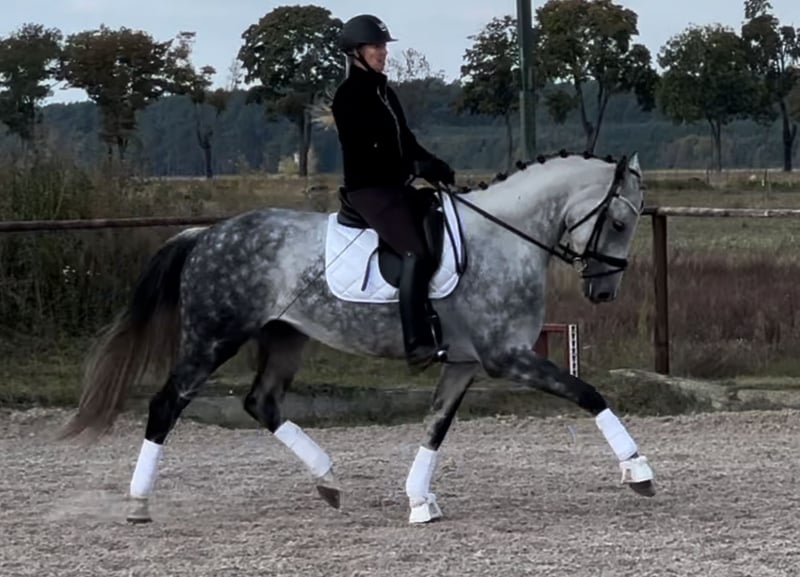 **Sales Advertisement: Beautiful Oldenburg Mare for Sale** For sale is an elegant Oldenburg mare, born in 2019. She presents herself in a shining apple grey coat and has a height of 169 cm. This talented mare is excellently suited for dressage, as she possesses three very good basic gaits. She already shows promising signs in her training. Her friendly and open nature makes her a pleasant partner both in handling and under saddle. Since she was only backed earlier this year, she has not yet been presented at competitions. Her training level is at A level. She is well-mannered and well-behaved. If you are looking for a talented and affectionate mare with the potential to succeed in dressage, please feel free to contact us for more information or to arrange a viewing. We look forward to your inquiry! The horse is offered on behalf of a client.