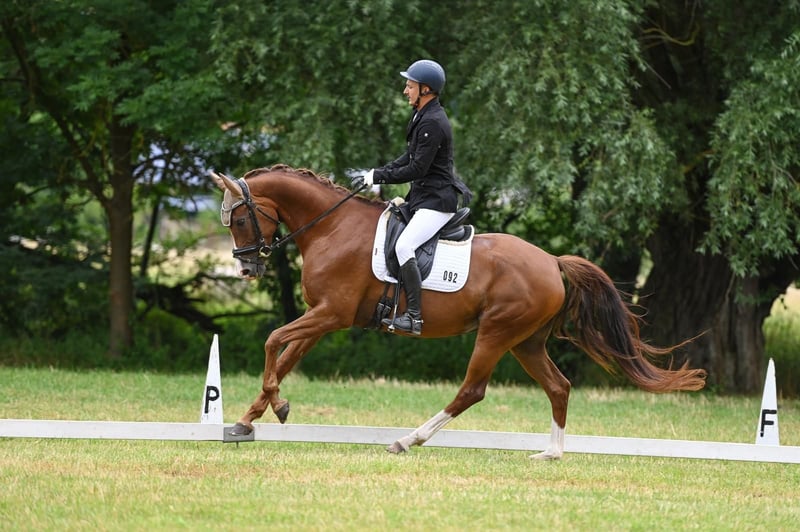 Aktuelle Röntgenbilder (Huf, Bein, Rücken vom 16.03.2026) OHNE BEFUND Können bei ernsthaftem Interesse versendet werden. | Alter: 8 Jahre | Stockmaß: 166 cm | Abstammung: Dancier x Rubinstern Noir | Farbe: Dunkelfuchs Danci überzeugt nicht nur durch ihr elegantes Exterieur, sondern auch durch ihr Talent und ihre Rittigkeit. Bereits A-Dressuren mit Noten um 8,0 gewonnen, sicher in L-Lektionen eingeführt, Außengalopp und fliegende Wechsel beherrscht sie spielerisch. Sie ist fein an den Hilfen, leicht in der Hand, sensibel und sehr lernbereit – ideal für ambitionierte Reiter mit feinem Sitz und Erfahrung in der Jungpferdeausbildung. Wer ihr Sicherheit und Vertrauen gibt, findet in Danci eine Partnerin mit Perspektive bis in die höhere Dressur. Im täglichen Umgang ist sie unkompliziert, menschenbezogen und anhänglich. Röntgen-TÜV ohne Befund, regelmäßig geimpft, entwurmt und Zähne gemacht. Wir wünschen uns für Danci ein liebevolles Zuhause mit artgerechter Haltung und Pferdegesellschaft. Platz vor Preis. Vorstellung und Probereiten nach Absprache (50 € Aufwandsentschädigung, bei Kauf verrechnet).