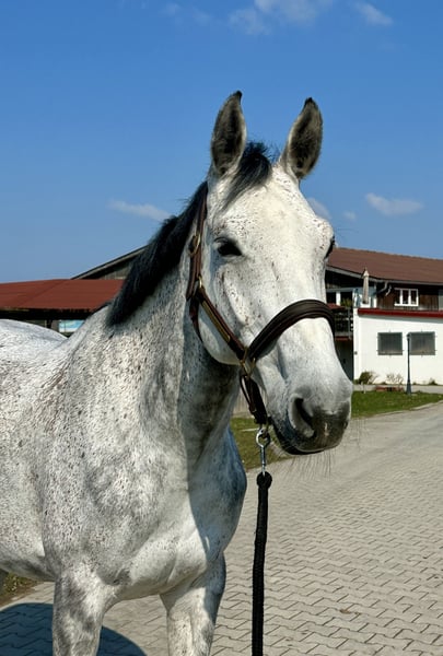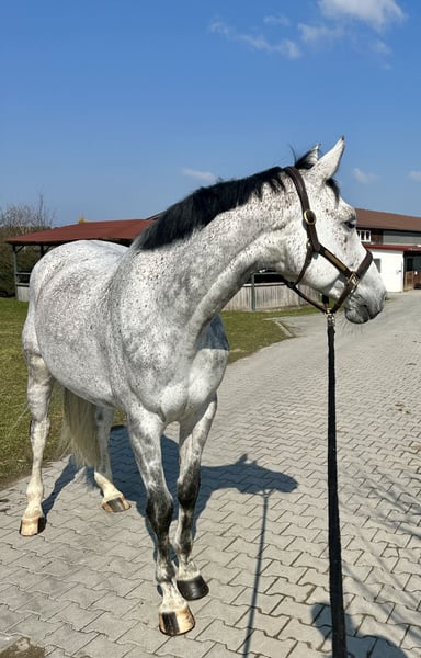 Mit Queen Josephine bieten wir eine liebenswerte, leichtrittige Schimmelstute an, die durch ihr angenehmes Reitgefühl und ihre Zuverlässigkeit begeistert. Sie ist die ideale Partnerin für Reiter, die ein sicheres, motiviertes Pferd für den gehobenen Freizeitbereich suchen. Die Stute konnte bereits mehrfach Platzierungen in Spring- und Dressurprüfungen der Klasse A** erzielen und wurde bis zur Klasse L vorgestellt. Besonders hervorzuheben ist ihr Talent in der Dressur, welches bislang noch nicht voll ausgeschöpft wurde – hier bietet sie ihrem neuen Besitzer noch weiteres Entwicklungspotenzial. Im täglichen Umgang zeigt sich Queen Josephine unkompliziert und ausgeglichen. Im Viereck arbeitet sie konzentriert mit, ist stets aufmerksam und vermittelt ihrem Reiter ein sicheres Gefühl – sie ist weder schreckhaft noch guckig. Auch im Gelände präsentiert sie sich in der Gruppe brav und zuverlässig. Sie ist verladefromm, schmiedefromm und insgesamt ein absolut angenehmer Partner im Alltag. Sie stammt ab von Joliot x Quintender x Calvadur, misst ca. 172cm und ist von privat zu verkaufen. Queen Josephine eignet sich perfekt für Reiter, die ein zuverlässiges, rittiges Pferd mit Potenzial suchen – sei es für entspannte Ausritte, dressurmäßige Arbeit oder den Turnierstart.