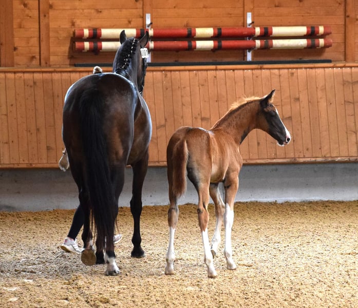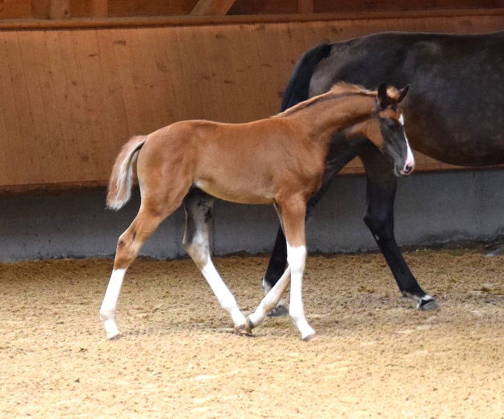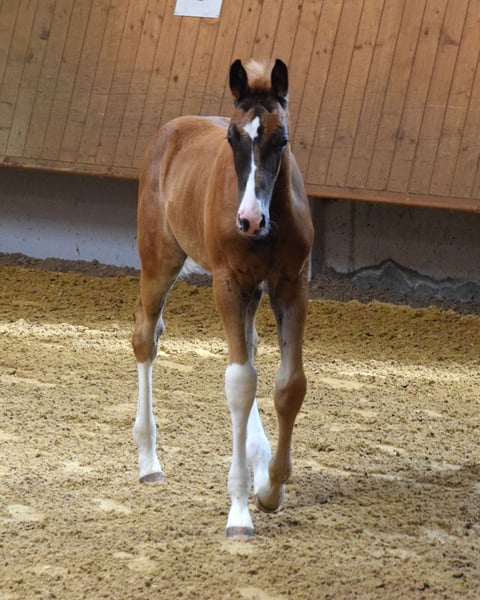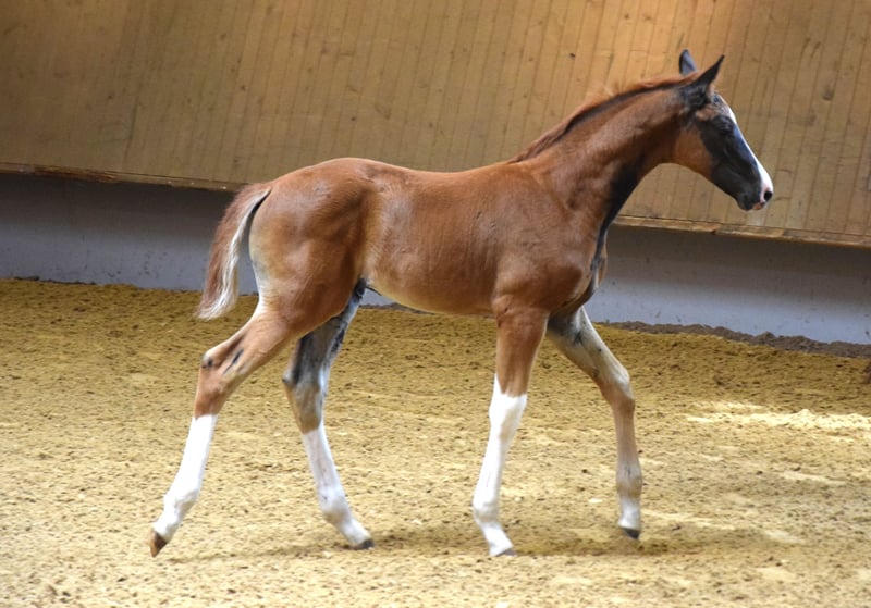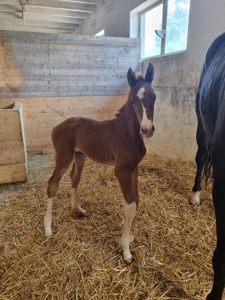 A causa di motivi di allevamento e di un soggiorno all'estero, questa splendida, brave e premiata Verbandstute viene ceduta. Nata nel 2017, di colore baio scuro, circa 176 cm di altezza al garrese, figlia di FAHRENHEIT x STEDINGER. È cresciuta in paddock con molta libertà di movimento ed è stata montata da una cavallerista di livello S in età avanzata. A Oldenburg, è stata riconosciuta come cavalla da riproduzione con attestato VPr. e ha completato con successo la valutazione di selezione (SLP). Da allora è stata montata solo sporadicamente. Ha avuto due puledri (2023 e 2025) da BENICIO, entrambi premiati come puledri di alta qualità, entrambi di colore morello scuro. Non è stata fecondata per il 2026. Linea materna: Due cavalle di élite di fila, seguite da una cavalla di StPrST. Il fratello completo della madre è un stallone premiato di Oldenburg. Linea di sangue: Oldenburger Stamm 74.