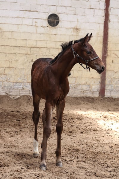 Nasz mały skarb ma aktywne tylne nogi z wystarczającym ruchem przez ciało. Jest bardzo pewny siebie, a jednocześnie zawsze grzeczny i bardzo towarzyski. Oczywiście zna już abecadło źrebiąt i chodzi na halterze. Warto więc przyjść i go zobaczyć.