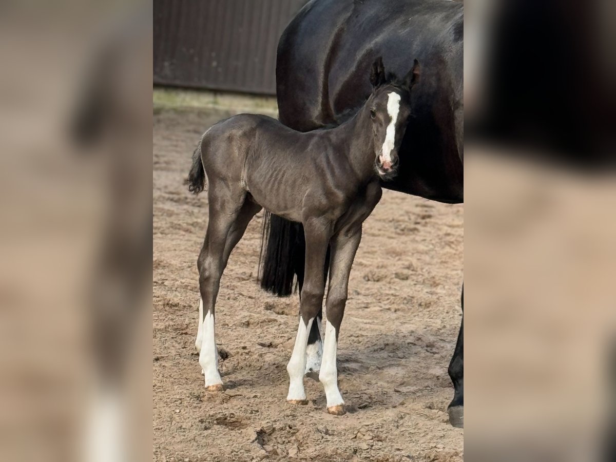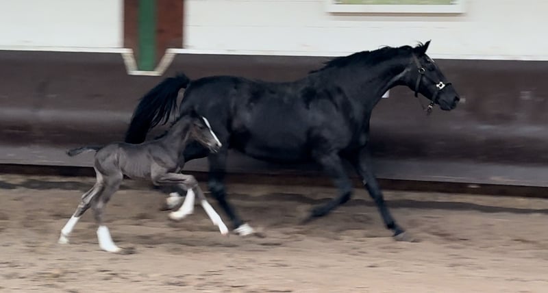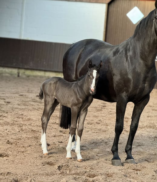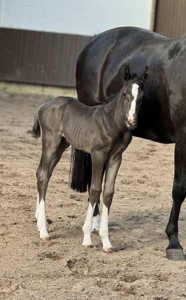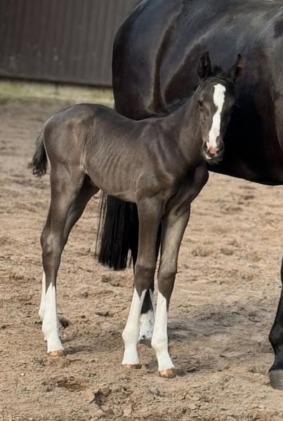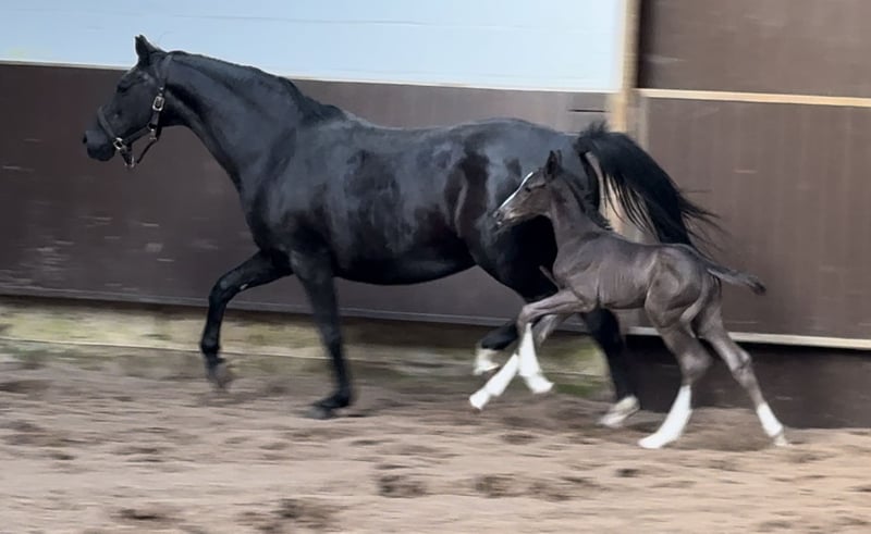 Wonderful black and double-dispositioned stallion prospect! Like his full brother (see other ads) he is also one of the best of his year! In the pictures 2 days old. Extremely interesting bloodline for dressage and show jumping alike! The equally high quality full sister has already been sold, another enormously strong moving full sister from last year can still be viewed on site. The sire Cafe au lait, champion stallion of his licensing, HLP winner and BuCha finalist, was himself victorious in the advanced classes and has made a name for himself in recent years as a double sire with top offspring. Cafe's Casimir" (Cafe au lait x Calido x Grannus) was the celebrated top prize winner at the Oldenburg Elite Auction, is a serial winner in advanced (S) level dressage competitions at a young age and has won Intermediaire I internationally. Kasselmann's mare Cafe's Caletta (Cafe au lait x Calato) has also already placed in advanced (S) level dressage and won international Grand Prix competitions. Cafe's Matts (Cafe au lait x Don Frederico) was the second most expensive dressage horse at the Oldenburg Summer Mixed Sales. Other young horses out of jumping-oriented broodmares have already been placed several times in tests for young dressage horses at advanced (A) to medium (M) level and are remarkably strong-moving and clear-headed. There is no doubt that the Cafe au lait offspring are convincing in show jumping up to advanced level (e.g. from our breed Cafe's Champus: licensed, Vice World Champion of Young Horses, Cafe Junior: licensed, internationally successful in Saudi Arabia, Cafe's Columbo: licensed in France). Stationed at Paul Schockemöhle, Cafe au lait has already sired a number of internationally successful show jumpers, including "Royce", victorious in the FEI CSI5* $500,000 Rolex Grand Prix Wellington. Cafe au lait himself was a Bundeschampionat finalist under Philipp Weishaupt and has been successful up to advanced (S***) level in show jumping, but also has three spectacular GGAs and has been trained to advanced (S) level in dressage. The dam's sire of this promising foal, "De Kooning", has already produced Grand Prix horses such as Dalou Shan despite very limited breeding and, as a direct son of the unique Donnerhall, has a lot of Holsteiner blood on his dam's side. Despite a small number of offspring, he has already produced a number of licensed offspring, including a premium stallion in Neustadt Dosse, the dressage winner in Munich-Riem and another premium stallion! Our foals receive daily mineral feed and foal starter, regular EQUISTRO Haemolytan and Ipaligo Foal, worming and farrier are of course also a matter of course. The dams also receive special mare feed throughout their pregnancy, daily juice feed and linseed oil, as well as hay ad libitum. This ensures that our offspring are always in the best of health. Further foals and offspring from our own breeding on request. There are always a few broodmares in foal for sale. Video requests etc. only possible in advance via WhatsApp!