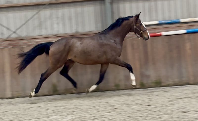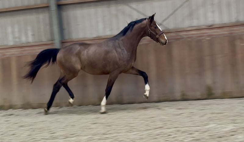 Bijzonder fraaie dressuurhengst uit eigen fokkerij met extra beweging. Deze jonge hengst beschikt over een aansprekend type met sterke verbindingen. Hij is correct en heeft een goed fundament. Hij beschikt over drie uitstekende basisgangen. Zijn stap is ruin en actief. In draf maakt hij een mooie zelfhouding. Hij heeft veel swung en al een goede balans. Ook heeft hij een goede buiging in het achterbeen dat hij goed onderbrengt en goed weet te dragen. Zijn galop is actief en mooi opwaards gesprongen. Hij komt uit een zeer goede moederlijn. Zijn moeder Dilena is in het bezit van het Elite predikaat en bracht in combinatie met Bordeaux al twee internationaal presterende Inter II dressuurpaarden. Afgelopen jaar werd haar veulen Vilena MP (v.Vino Tinto) één van de best verkochte veulens van de ELITE veulenveiling Borculo en vertrok naar de stallen vd Iron Spring Farm in Amerika. De grootmoederbracht o.a. de bekende Europees kampioen merrie ‘RILENA’ (v.Flemmingh). Bij interesse graag bellen of appen: +31(0)648271956 of +31643197337 Een video is op aanvraag te verkrijgen.